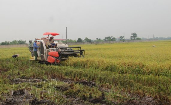 Nông dân huyện Thái Thụy thu hoạch lúa mùa.