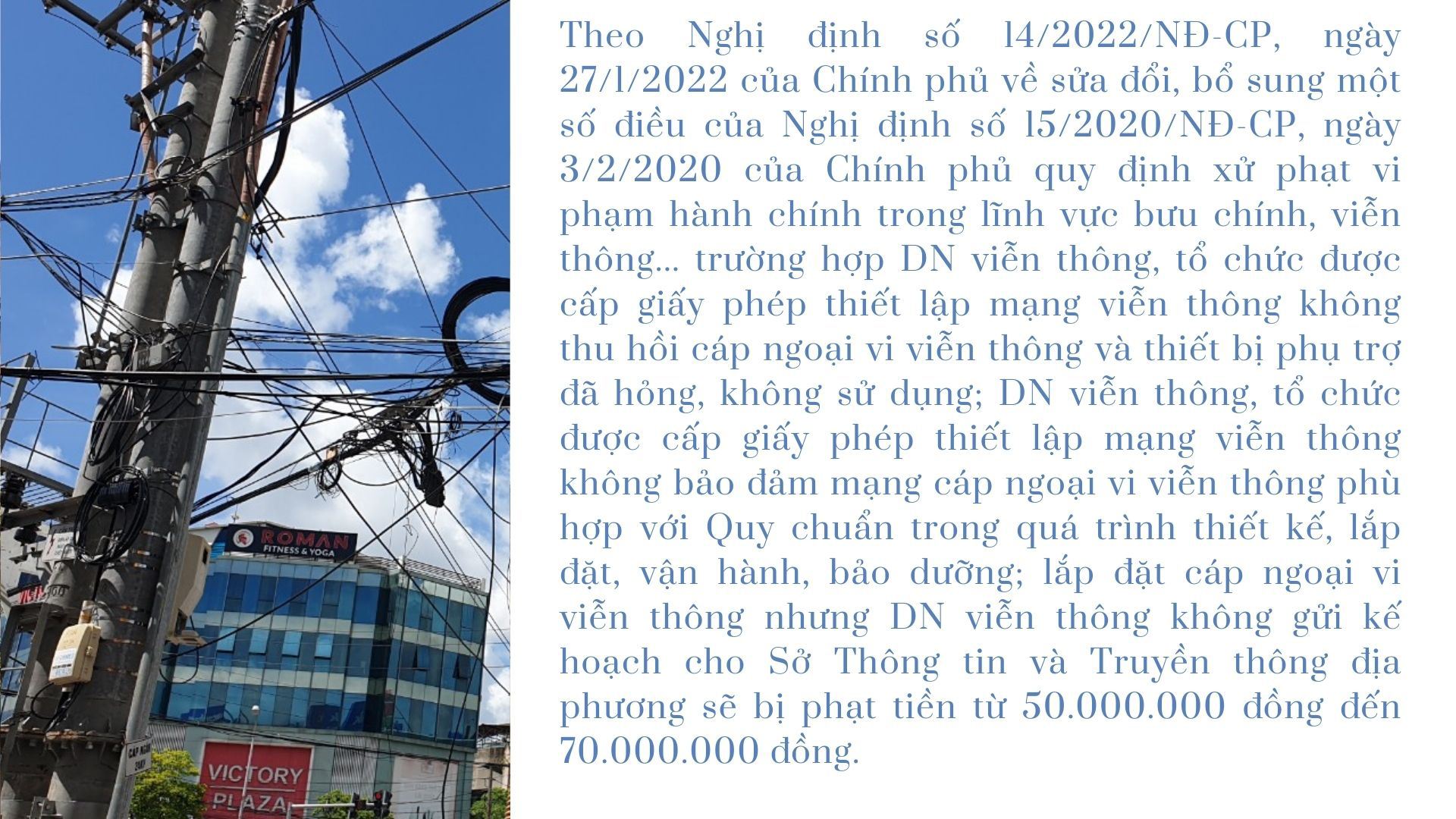 Theo thống kê, từ đầu năm 2022, trên địa bàn thành phố Thái Bình có khoảng 8.455m cáp ngoại vi viễn thông và hàng chục nghìn mét cáp ngoại vi viễn thông ở các huyện vi phạm Quy chuẩn quốc gia 33:2019/BTTTT của Bộ Thông tin và Truyền thông về lắp đặt mạng cáp ngoại vi viễn thông. Các vi phạm diễn ra từ nhiều năm nay như: kéo cáp thuê bao ngang qua đường phố, vắt trên cây xanh, treo trên cột đèn chiếu sáng đô thị. Tại các tuyến phố, dây cáp viễn thông mắc chằng chịt, cuộn thành từng búi. Nhiều tuyến cáp không sử dụng nhưng DN chủ quản không thu hồi, qua tác động của mưa nắng một số đoạn đứt, gãy, treo lủng lẳng trên đường phố gây mất mỹ quan, nguy hiểm cho người đi đường và nguy cơ mất an toàn cháy, nổ.