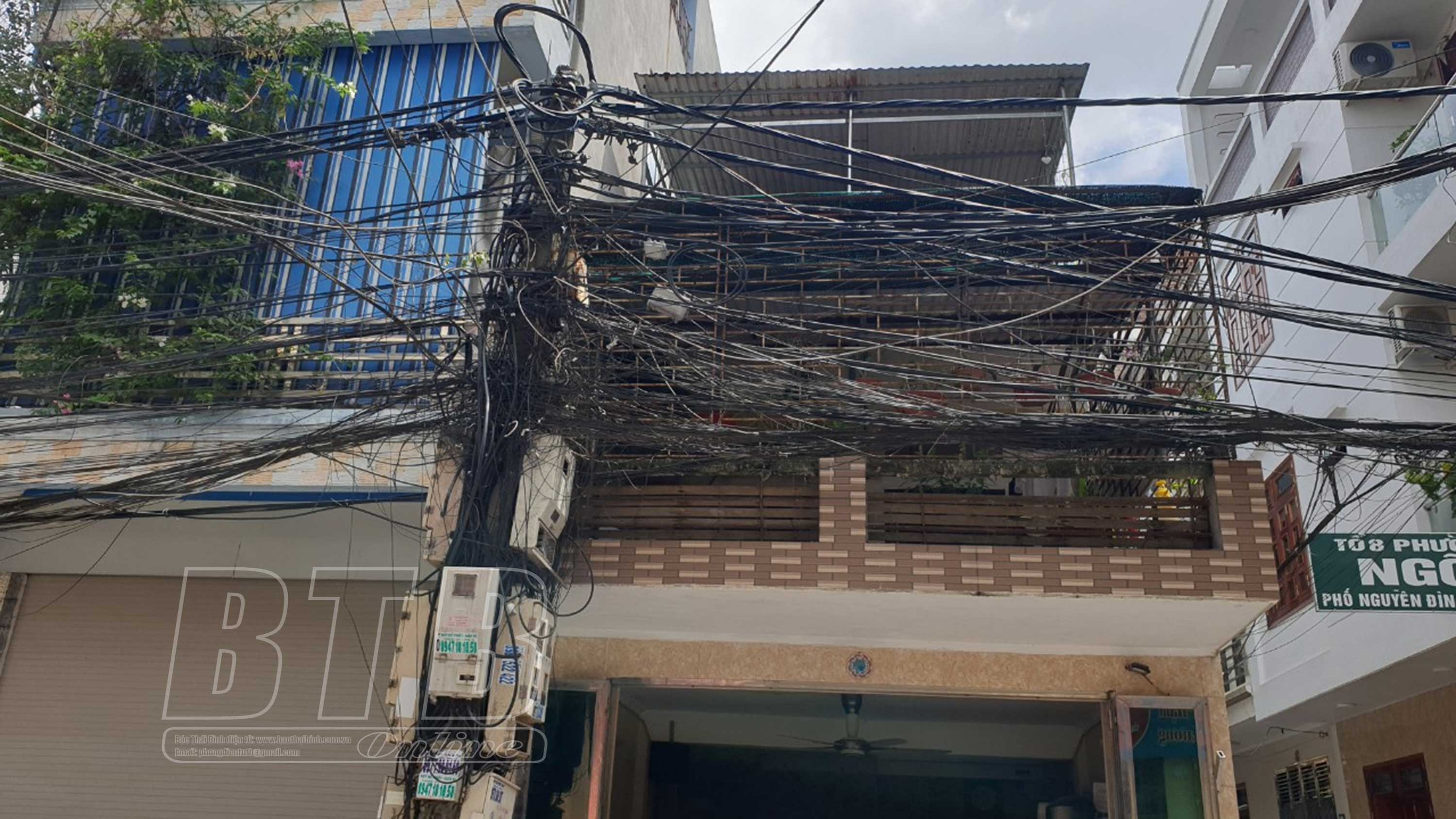 Phố Nguyễn Đình Chính, phường Kỳ Bá, thành phố Thái Bình số lượng lớn dây mạng viễn thông mắc chằng chịt, sát nhà dân, võng xuống đường gây mất mỹ quan đô thị và an toàn cho người dân.