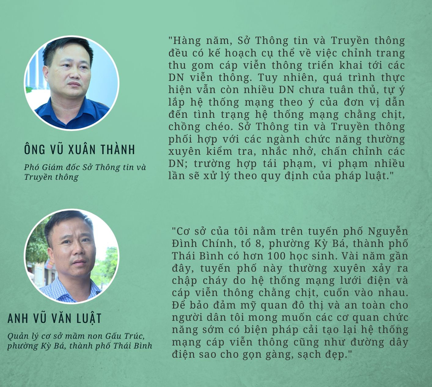 Bà Vũ Thị Mùi sống tại tổ 5, phường Đề Thám, thành phố Thái Bình là hộ kinh doanh mặt hàng vải ngay tại ngã tư giao cắt giữa đường Lê Quý Đôn và đường Trần Hưng Đạo nhiều lần chứng kiến đường dây mạng viễn thông kéo gãy cả biển quảng cáo và treo lơ lửng giữa đường gây nguy hiểm cho người tham gia giao thông. Bà Mùi cho biết, gia đình bà kinh doanh vải nên có treo biển giới thiệu sản phẩm ở tầng hai, hệ thống dây mạng viễn thông che kín và cuốn chằng chịt vào biển hiệu nhìn rất lôi thôi, nhếch nhác. Nhiều khi gió to kéo vỡ biển quảng cáo rơi xuống đường, dây mạng thì đứt treo lơ lửng giữa đường, rất nguy hiểm.