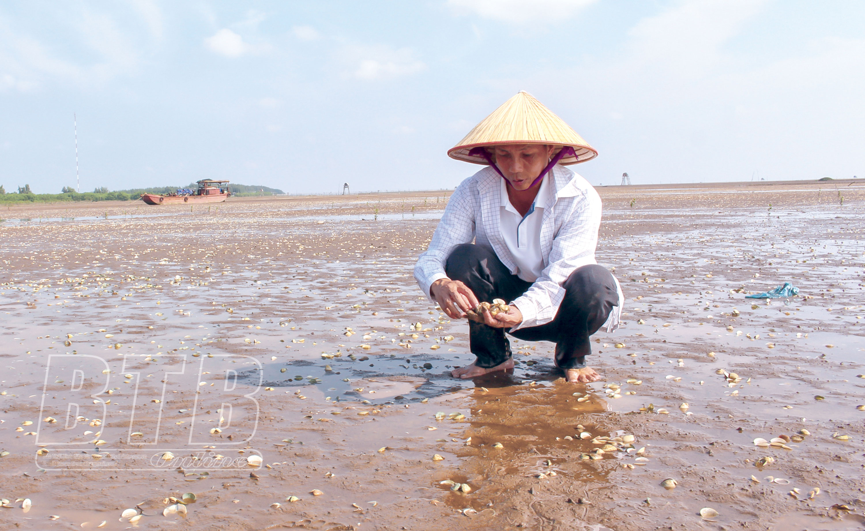 Vụ nuôi ngao năm nay, gia đình ông Nguyễn Bá Phường, thôn Tân Tiến, xã Thái Đô nuôi thả 6ha ngao thương phẩm tại vùng bãi triều ven biển. Thời gian gần đây, tại diện tích nuôi ngao của ông Phường đã xảy ra tình trạng ngao chết hàng loạt với tỷ lệ từ 30 - 40%. Để bảo đảm vệ sinh môi trường sống cho số ngao còn lại, gia đình ông đã tích cực thu gom toàn bộ lượng vỏ ngao chết, tiến hành vệ sinh bãi nuôi.
