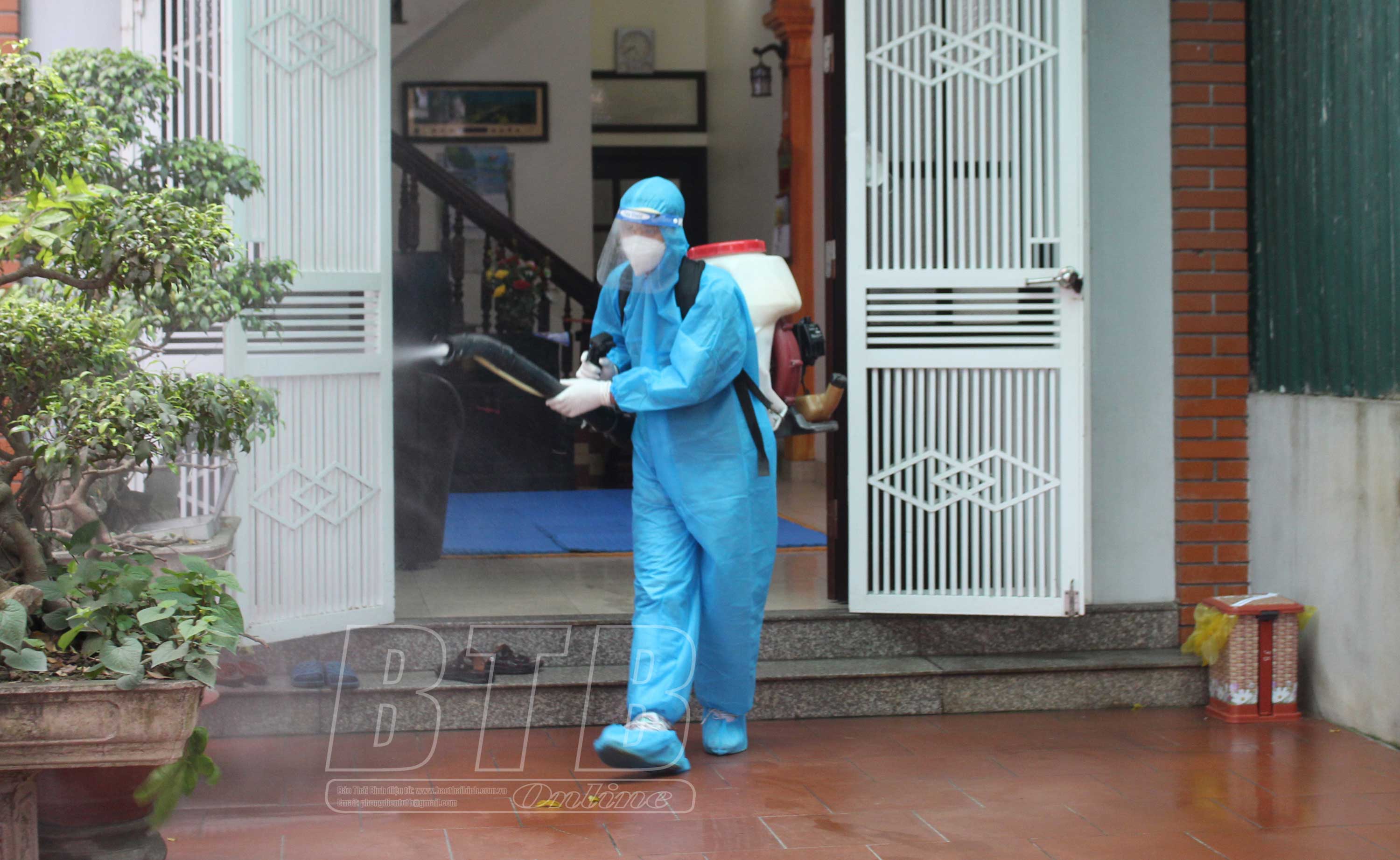 Cán bộ Trạm y tế xã Vũ Ninh (Kiến xương) phun thuốc diệt muỗi phòng chống sốt xuất huyết.