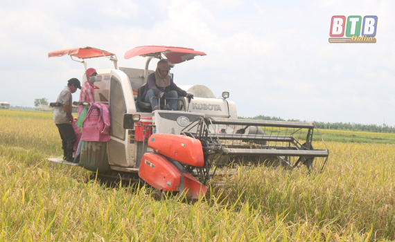 Nông dân xã Đồng Tiến (Quỳnh Phụ) thu hoạch lúa xuân.