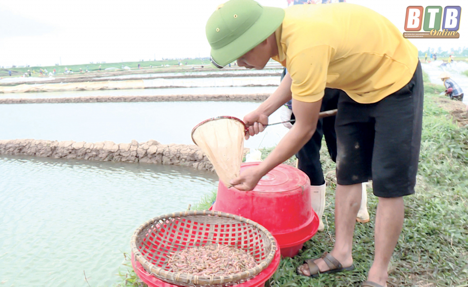 Chúng tôi về xã Thụy Việt đúng thời điểm nhân dân địa phương đang thu hoạch rươi. Đây là lần thứ ba trong năm, nhân dân địa phương được thu hoạch rươi. Trên quãng đường đê dài chưa đầy 1km với tổng diện tích trong đồng chỉ khoảng 60ha mà có tới hàng trăm người với các loại dụng cụ có thể dùng được để thu vớt rươi như: xô, chậu, vợt...
