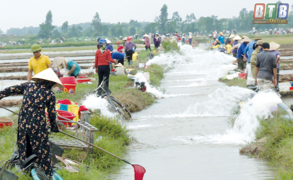 Hàng trăm người dân xã Thụy Việt với các loại dụng cụ thu vớt rươi.