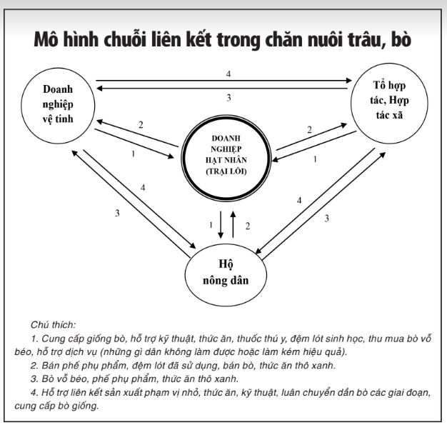 Cần thành lập các HTX, THT chăn nuôi tại các khu quy hoạch cho các đối tượng chăn nuôi vệ tinh và tổ chức cho các hộ tham gia HTX, THT theo nguyên tắc tự nguyện. Tùy theo nhu cầu thực tiễn chăn nuôi của từng địa phương, theo từng thời kỳ, từng công đoạn mà bố trí số lượng, quy mô HTX, THT ở mỗi địa phương cho phù hợp để bảo đảm sự bền vững của liên kết. Cấp ủy, chính quyền, đoàn thể cấp huyện và xã có nhiệm vụ chỉ đạo, xây dựng, hướng dẫn tổ chức sản xuất chăn nuôi theo chuỗi giá trị; bảo đảm hỗ trợ doanh nghiệp và hộ chăn nuôi trong việc hỗ trợ chính sách, đất đai, môi trường đầu tư, khoa học kỹ thuật; tập huấn chuyển giao khoa học kỹ thuật cho hộ chăn nuôi, đào tạo dẫn tinh viên phục vụ thụ tinh nhân tạo, đào tạo đủ số lượng, chất lượng đội ngũ nhân lực kỹ thuật về chăn nuôi trâu, bò...
