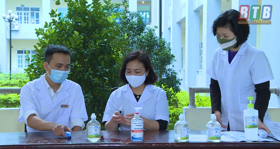 Cán bộ y tế Trường Cao đẳng Y tế Thái Bình chuẩn bị nước rửa tay, máy đo thân nhiệt để đón học sinh lớp 12, Trường THPT Chuyên Thái Bình trở lại trường.