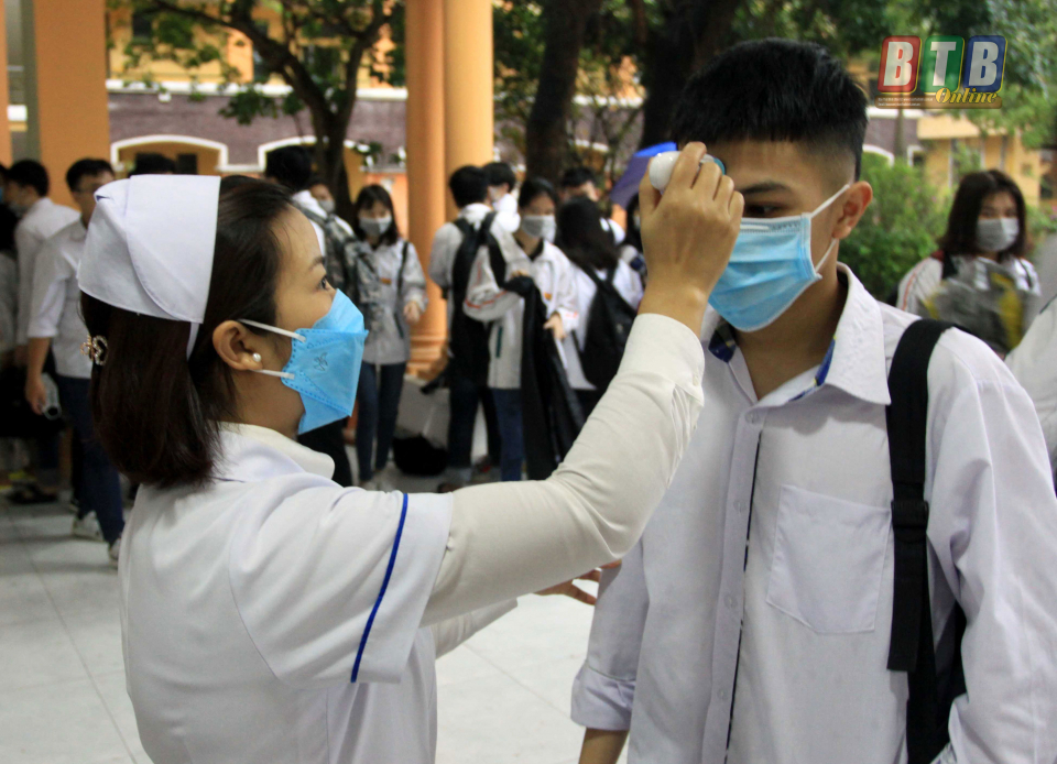 Giáo viên Trường THPT Chuyên Thái Bình tuyên truyền, hướng dẫn và đo thân nhiệt cho học sinh.
