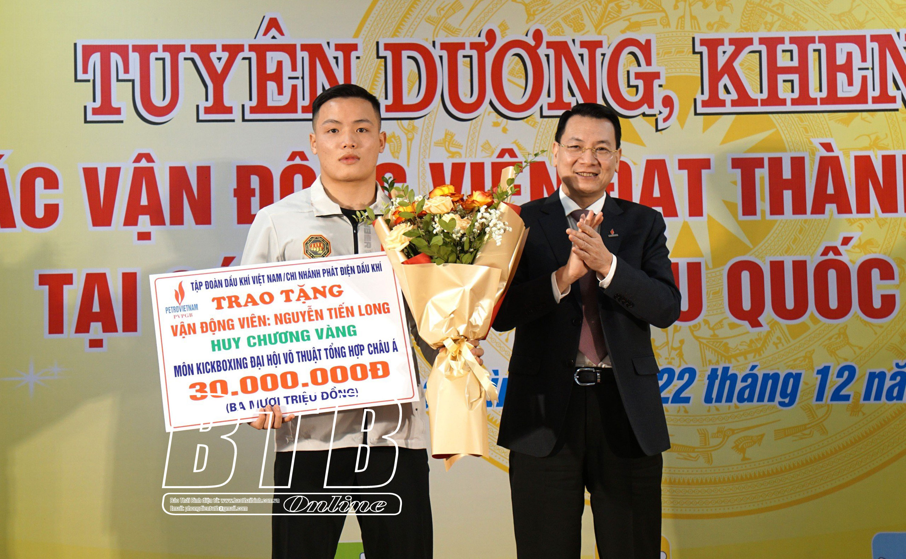 Lãnh đạo Tập đoàn Dầu khí Việt Nam trao thưởng cho VĐV môn Kickboxing đạt HCV tại giải vô địch võ thuật tổng hợp châu Á.