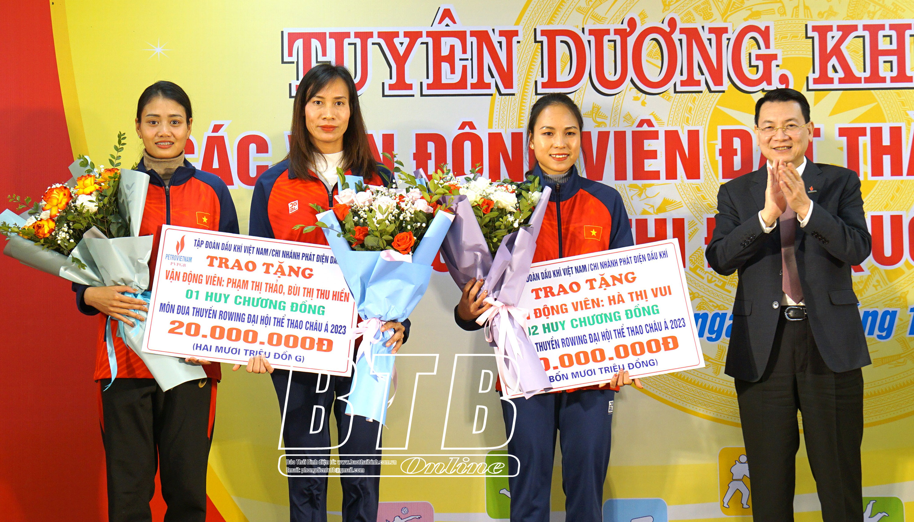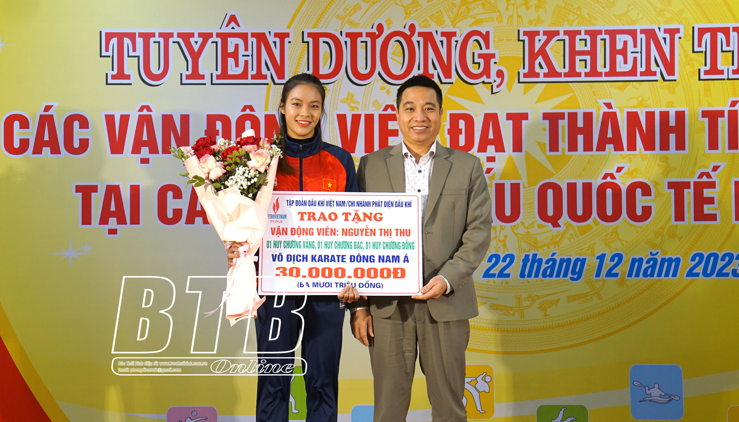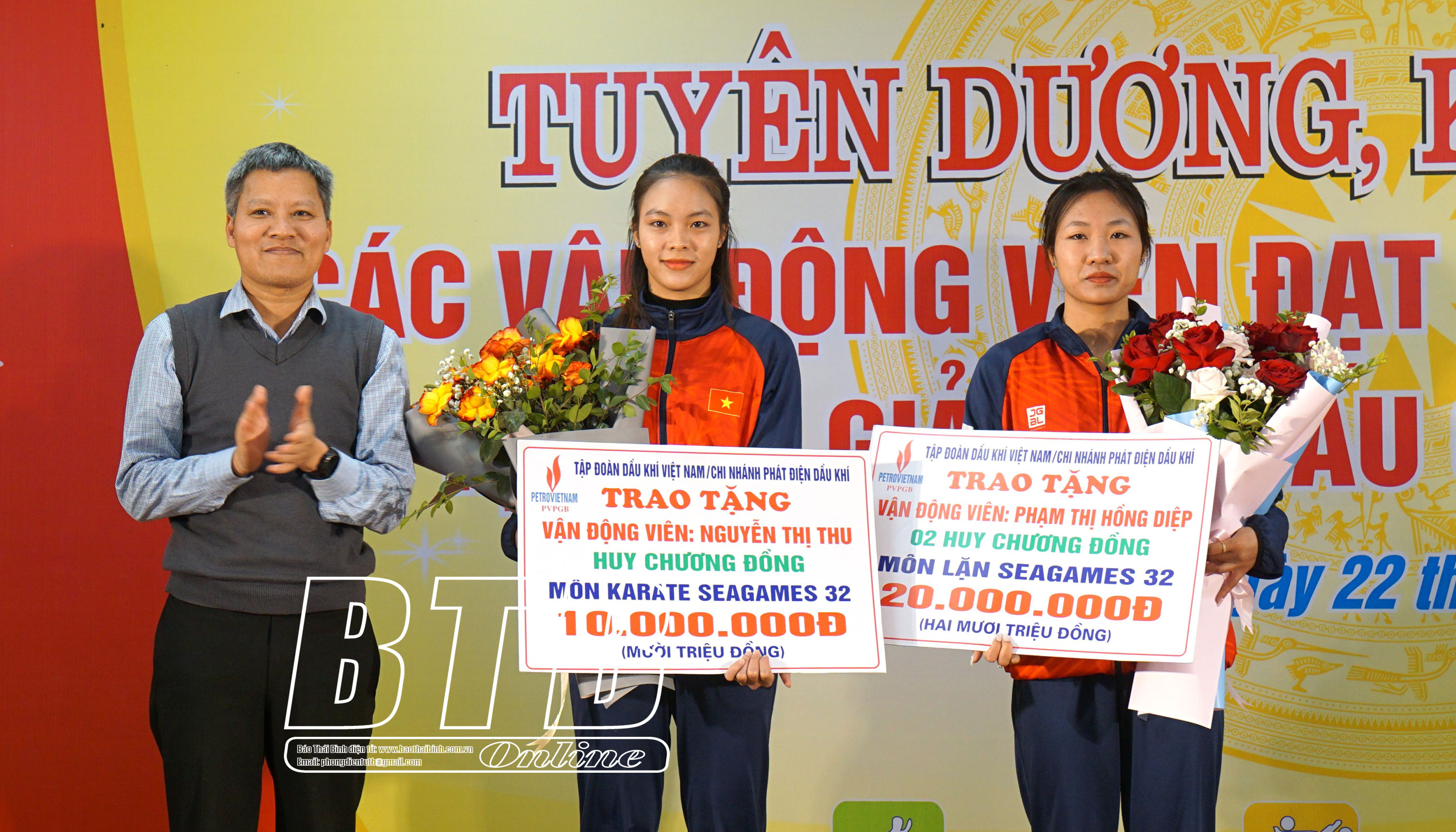 Nhân dịp này, lãnh đạo Tập đoàn Dầu khí Việt Nam đã trao thưởng cho 3 VĐV môn đua thuyền đạt thành tích tại ASIAD 19 và VĐV môn Kickboxing đạt HCV tại giải vô địch võ thuật tổng hợp châu Á. Lãnh đạo Ngân hàng TMCP Ngoại thương Việt Nam chi nhánh Thái Bình trao thưởng cho VĐV môn Wushu và jujitsu đạt HCV, bạc tại SEA Games 32. Lãnh đạo Nhà máy Nhiệt điện Thái Bình 2 trao thưởng cho các VĐV đạt HCĐ tại SEA Games 32 và VĐV đạt bộ HCV, bạc, đồng tại giải vô địch Karate Đông Nam Á.