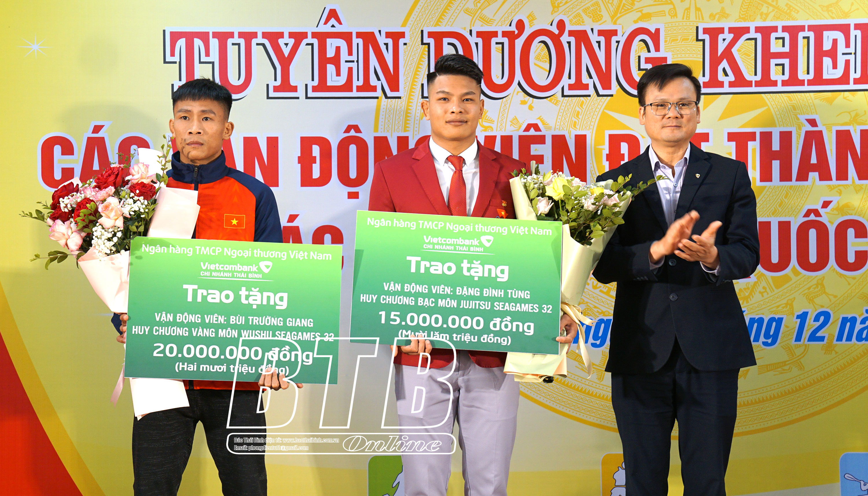 Lãnh đạo Ngân hàng TMCP Ngoại thương Việt Nam chi nhánh Thái Bình trao thưởng cho VĐV môn wushu và jujitsu đạt HCV, HCB tại SEA Games 32.