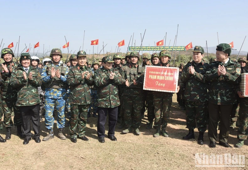 Thủ tướng Phạm Minh Chính tặng quà động viên cán bộ, chiến sĩ tham gia cuộc diễn tập. (Ảnh: TRẦN HẢI).