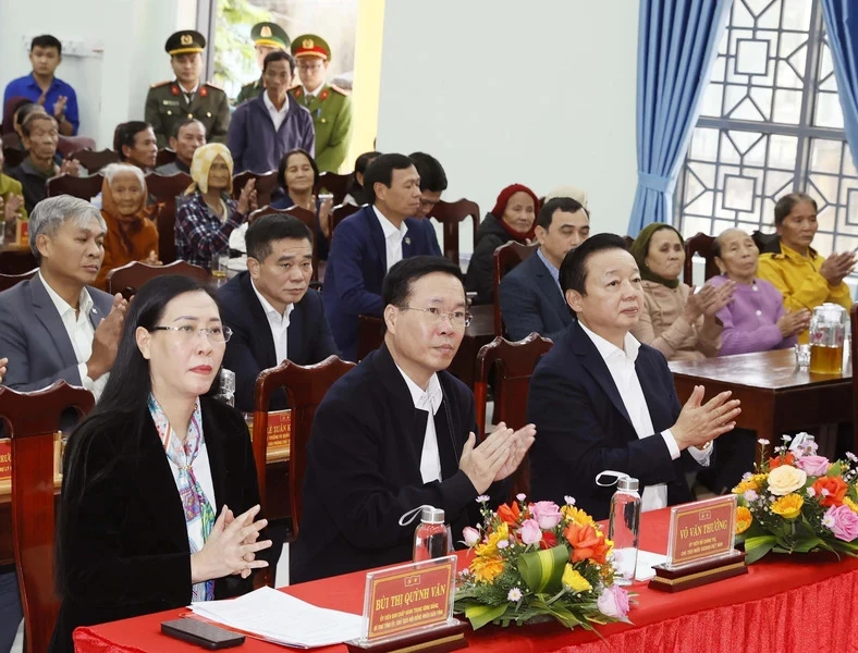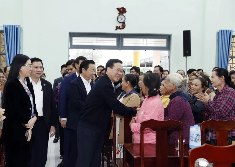 Nhân dịp này, Chủ tịch nước Võ Văn Thưởng trao quà tặng các gia đình chính sách, hộ nghèo, người dân có hoàn cảnh khó khăn của xã Bình Thuận.