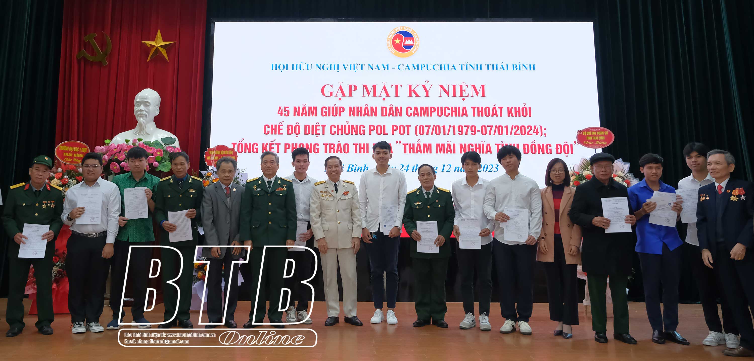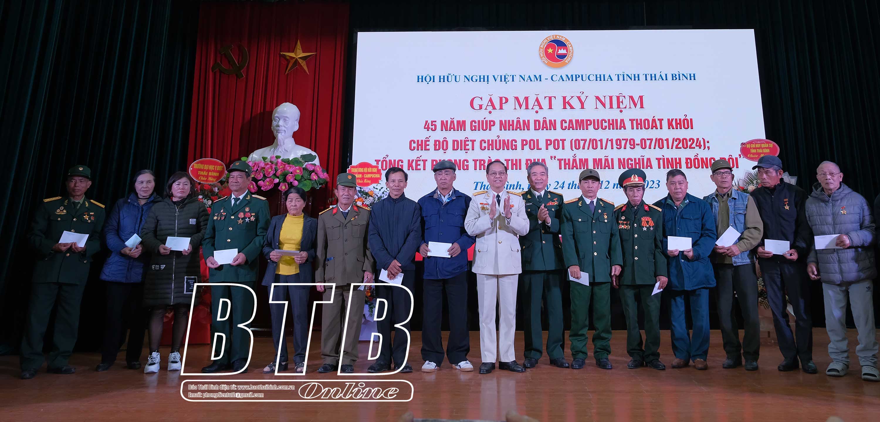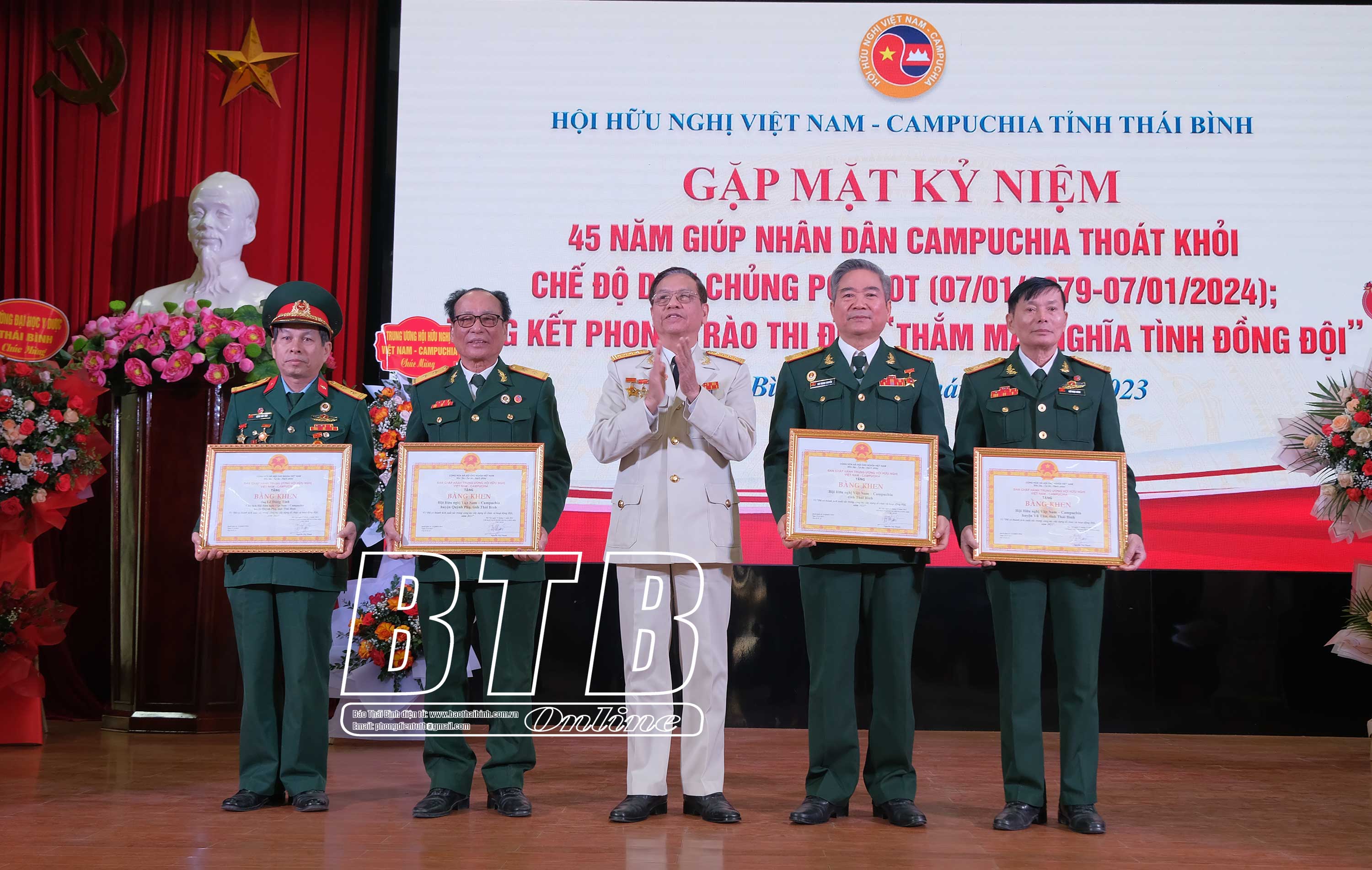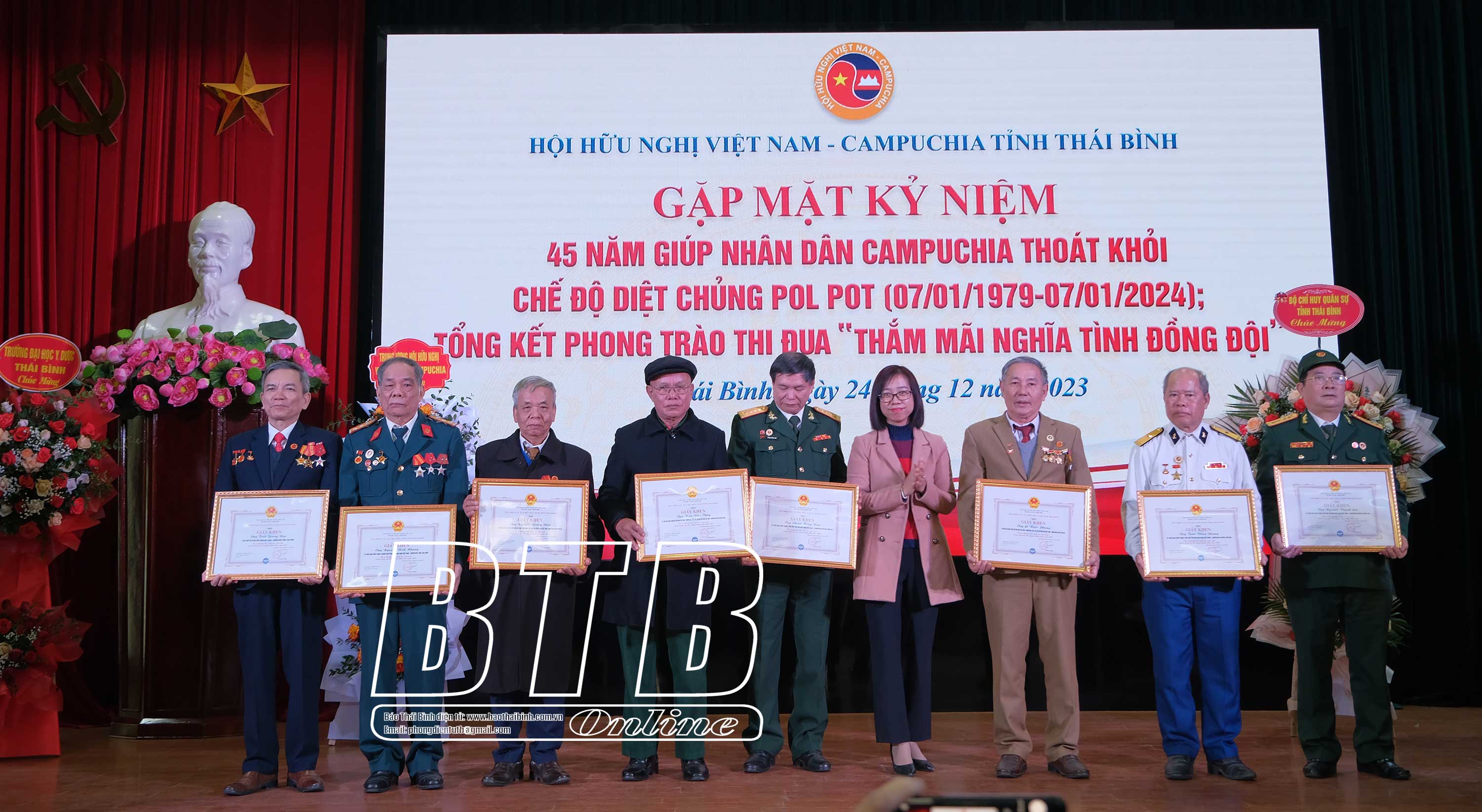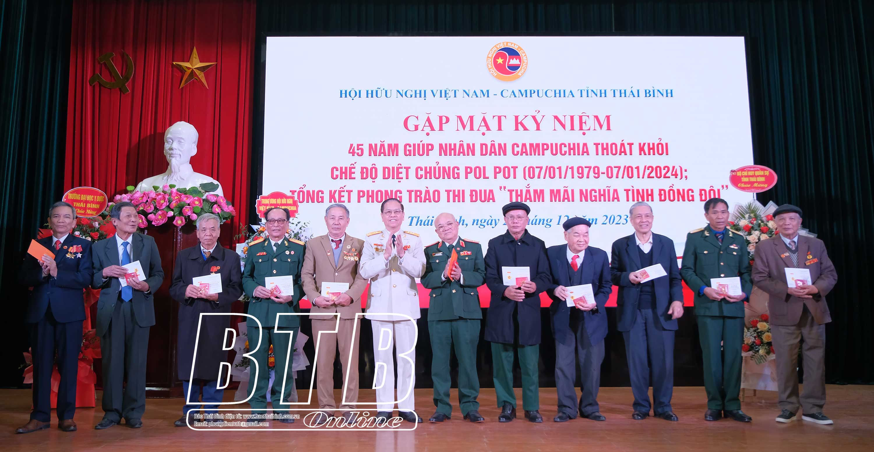 Nhân dịp này, Hội Hữu nghị Việt Nam - Campuchia tỉnh đã trao quà cho gia đình thương binh, liệt sĩ; trao kỷ niệm chương, bằng khen, giấy khen cho các tập thể, cá nhân có thành tích xuất sắc và trao công bố quyết định nhận đỡ đầu 10 sinh viên Campuchia đang học tập tại Trường Đại học Y Dược Thái Bình.
