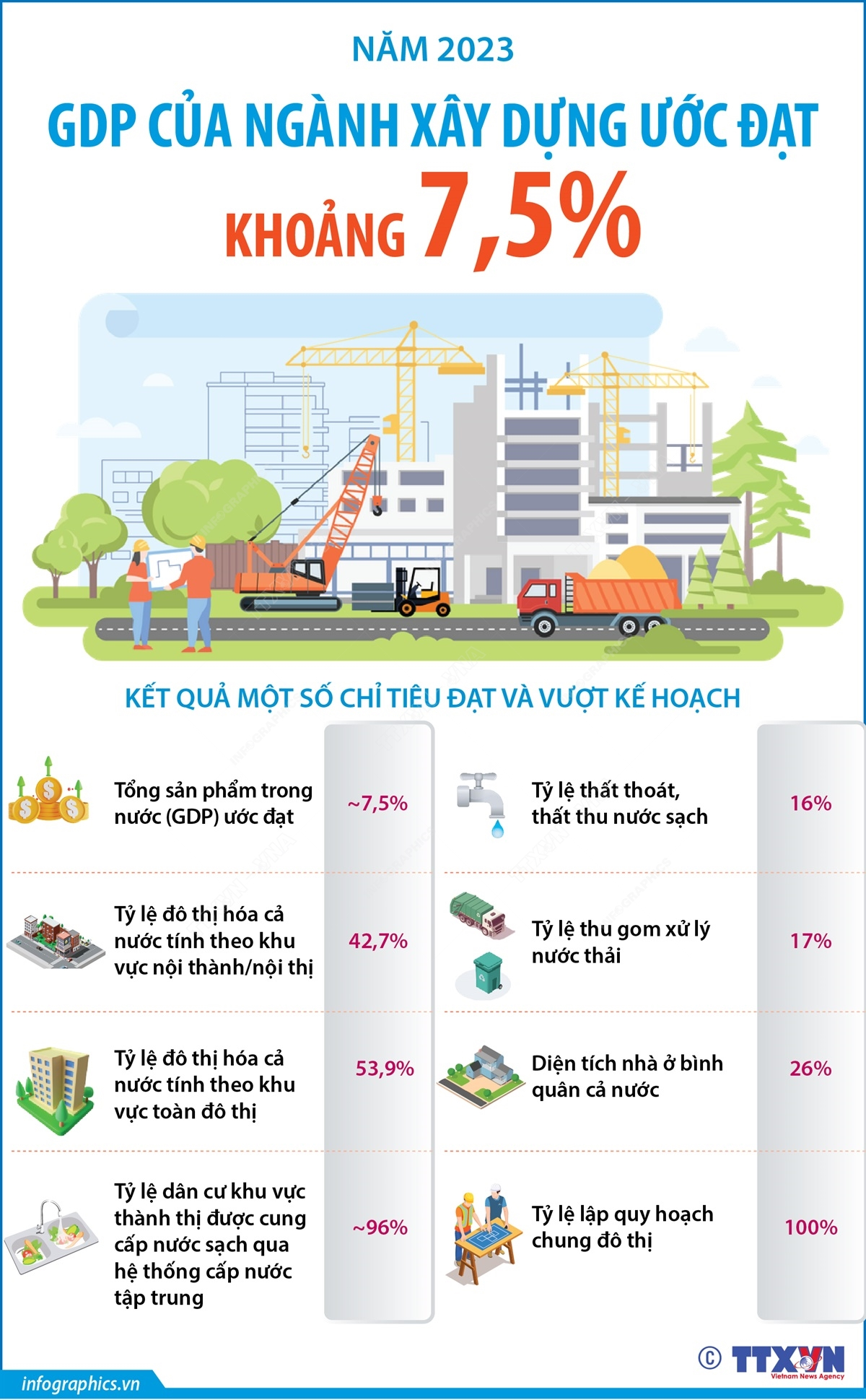 Năm 2023, tổng sản phẩm trong nước (GDP) của ngành Xây dựng ước đạt khoảng 7,5% (vượt so với chỉ tiêu đề ra là 7,3%). Tỷ lệ đô thị hóa cả nước tính theo khu vực toàn đô thị đạt 53,9%.