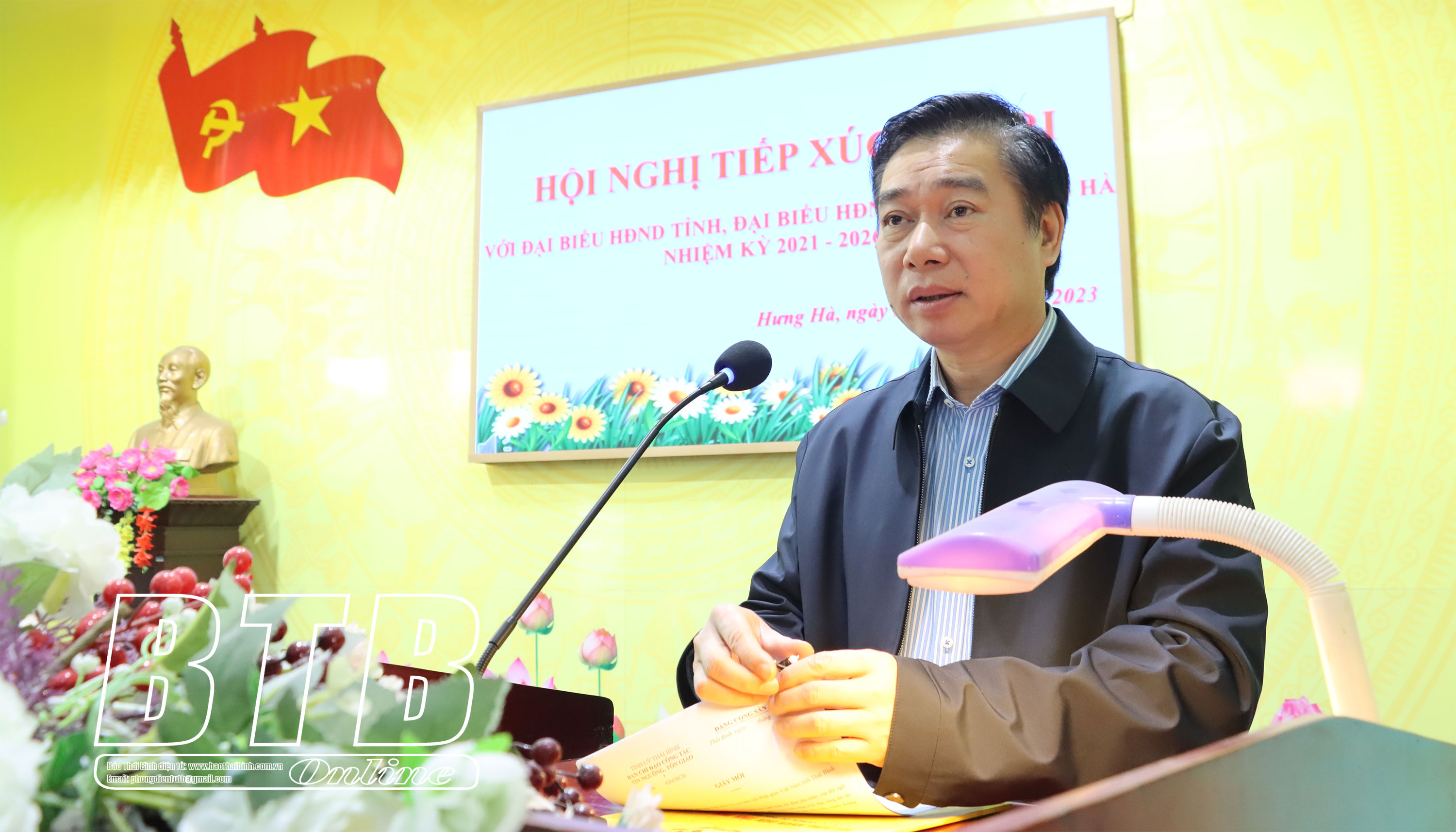 Đồng chí Trưởng ban Dân vận Tỉnh ủy và đại diện các đại biểu HĐND tỉnh, lãnh đạo huyện Hưng Hà đã thông tin nhanh với cử tri một số kết quả nổi bật trong phát triển kinh tế - xã hội của tỉnh, của huyện; nhất là về thu hút đầu tư, triển khai các dự án trọng điểm, gắn kết lễ hội, di tích lịch sử với phát triển du lịch tâm linh, nông nghiệp với du lịch sinh thái, du lịch biển.