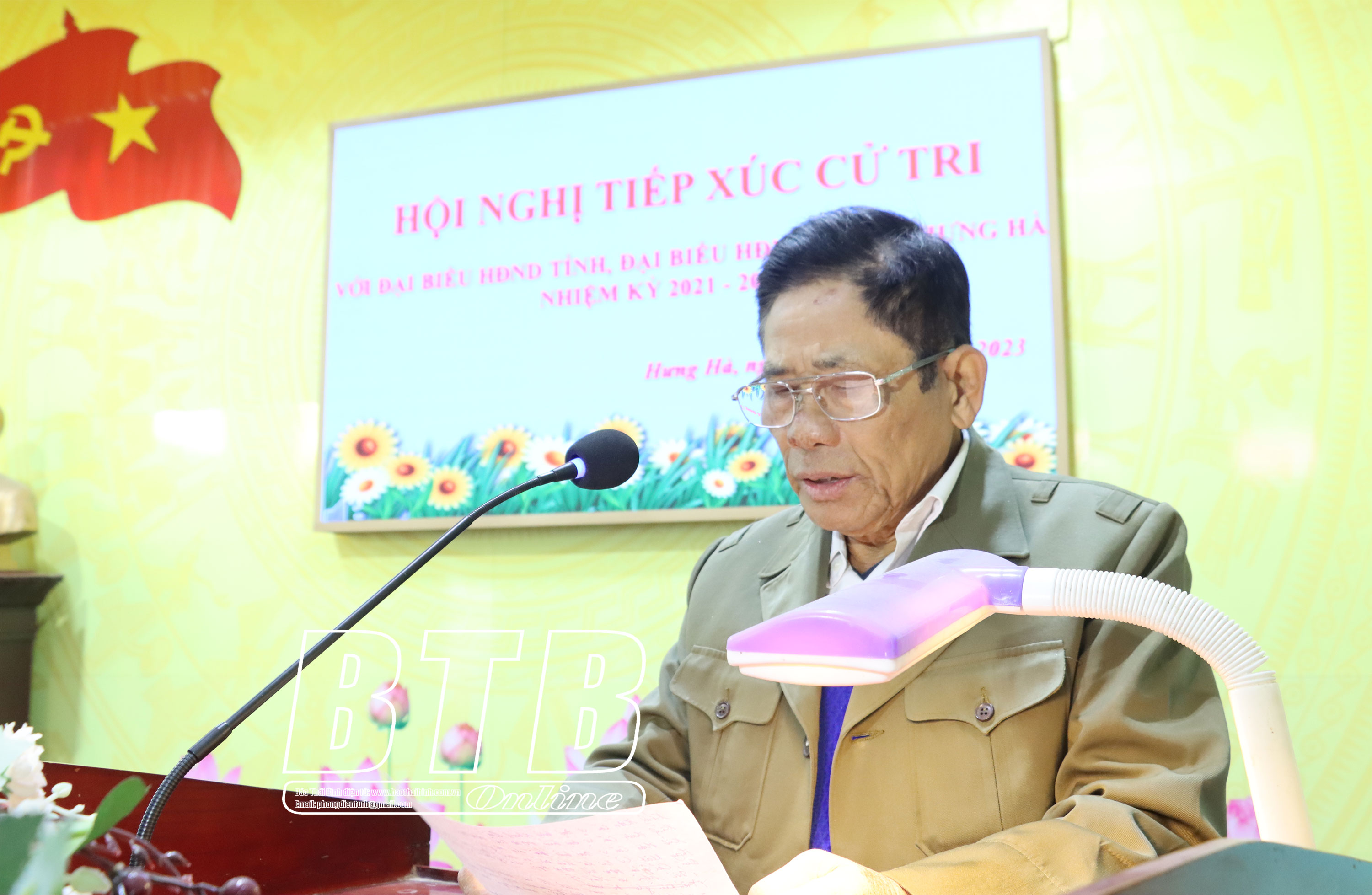 Sau khi nghe đại diện đại biểu HĐND tỉnh, đại biểu HĐND huyện báo cáo kết quả kỳ họp thứ bảy, HĐND tỉnh, HĐND huyện, cử tri huyện Hưng Hà phát biểu đánh giá cao kết quả kỳ họp; trong đó việc lấy phiếu tín nhiệm đối với người giữ chức vụ do HĐND bầu được tổ chức khoa học, khách quan, công tâm. Cử tri mong HĐND các cấp tăng cường giám sát các vấn đề cử tri kiến nghị, đôn đốc thủ trưởng các ngành thực hiện lời hứa, các cấp, các ngành giải quyết thấu đáo kiến nghị của cử tri. Cử tri cũng đề nghị đẩy nhanh tiến độ triển khai dự án mở rộng Di tích quốc gia đặc biệt Khu lăng mộ và đền thờ các vị vua triều Trần, tổ chức lễ hội đền Trần có nhiều hoạt động thiết thực hơn để thu hút du khách về dự lễ; thu hồi đất của dân phải sớm triển khai dự án; đẩy nhanh tiến độ thi công một số tuyến đường; bố trí kinh phí tổ chức nạo vét một số sông trục tạo thuận lợi cho tưới tiêu sản xuất; có giải pháp giúp một số địa phương khó khăn tạo nguồn xử lý nợ đọng xây dựng cơ bản.
