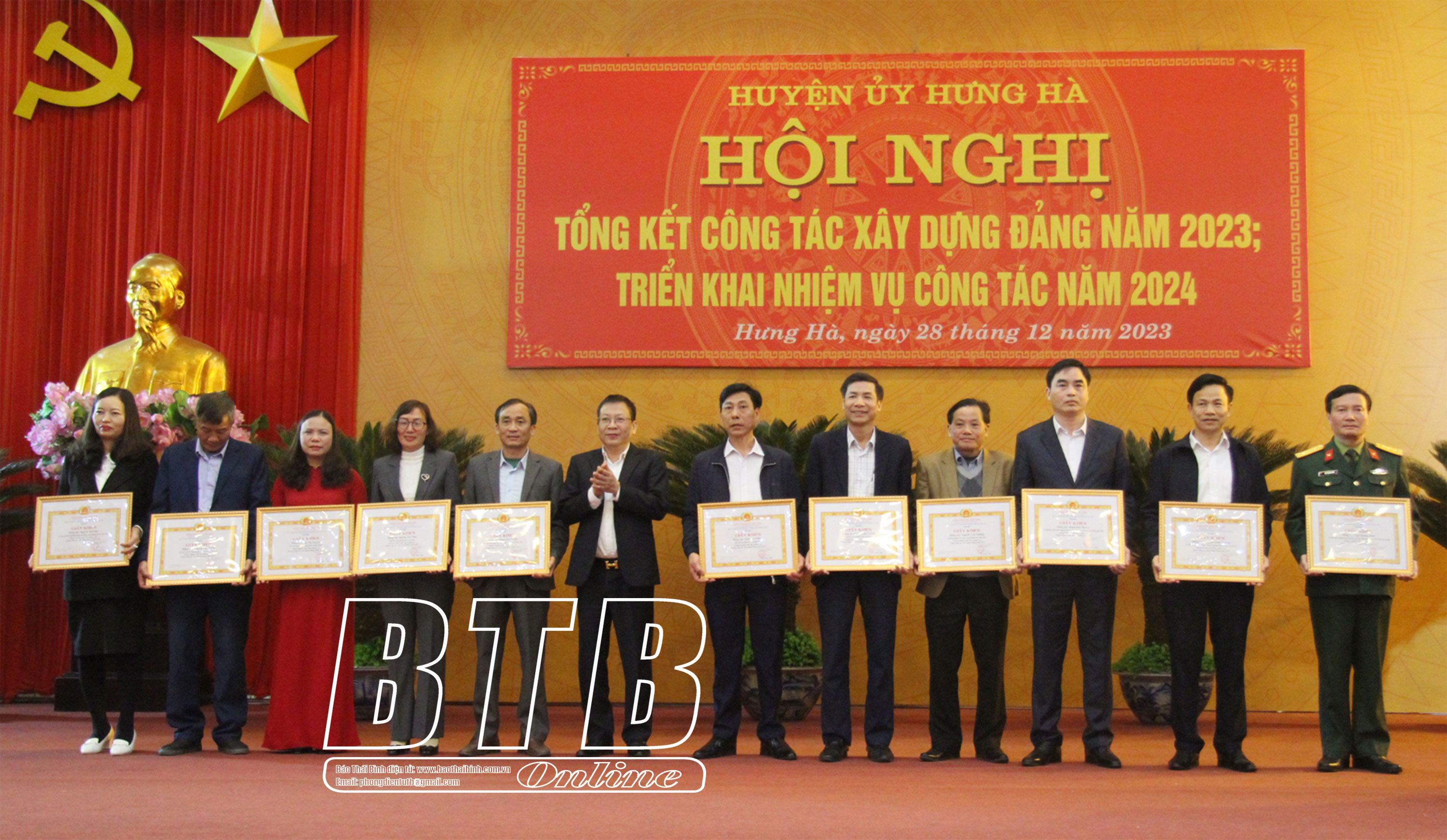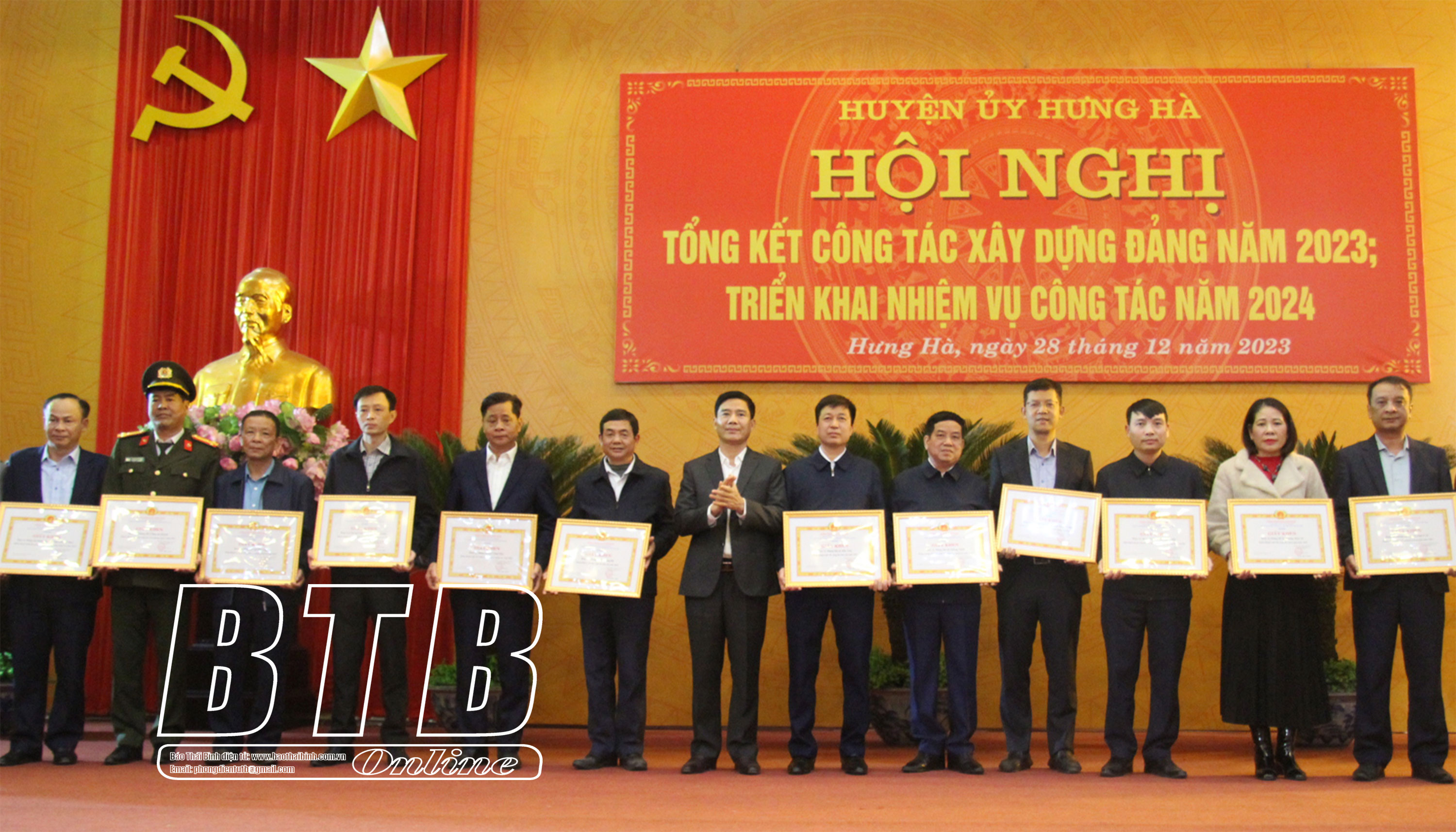Lãnh đạo Huyện ủy Hưng Hà trao giấy khen cho 11 cán bộ, đảng viên hoàn thành xuất sắc nhiệm vụ trong công tác xây dựng Đảng năm 2023.