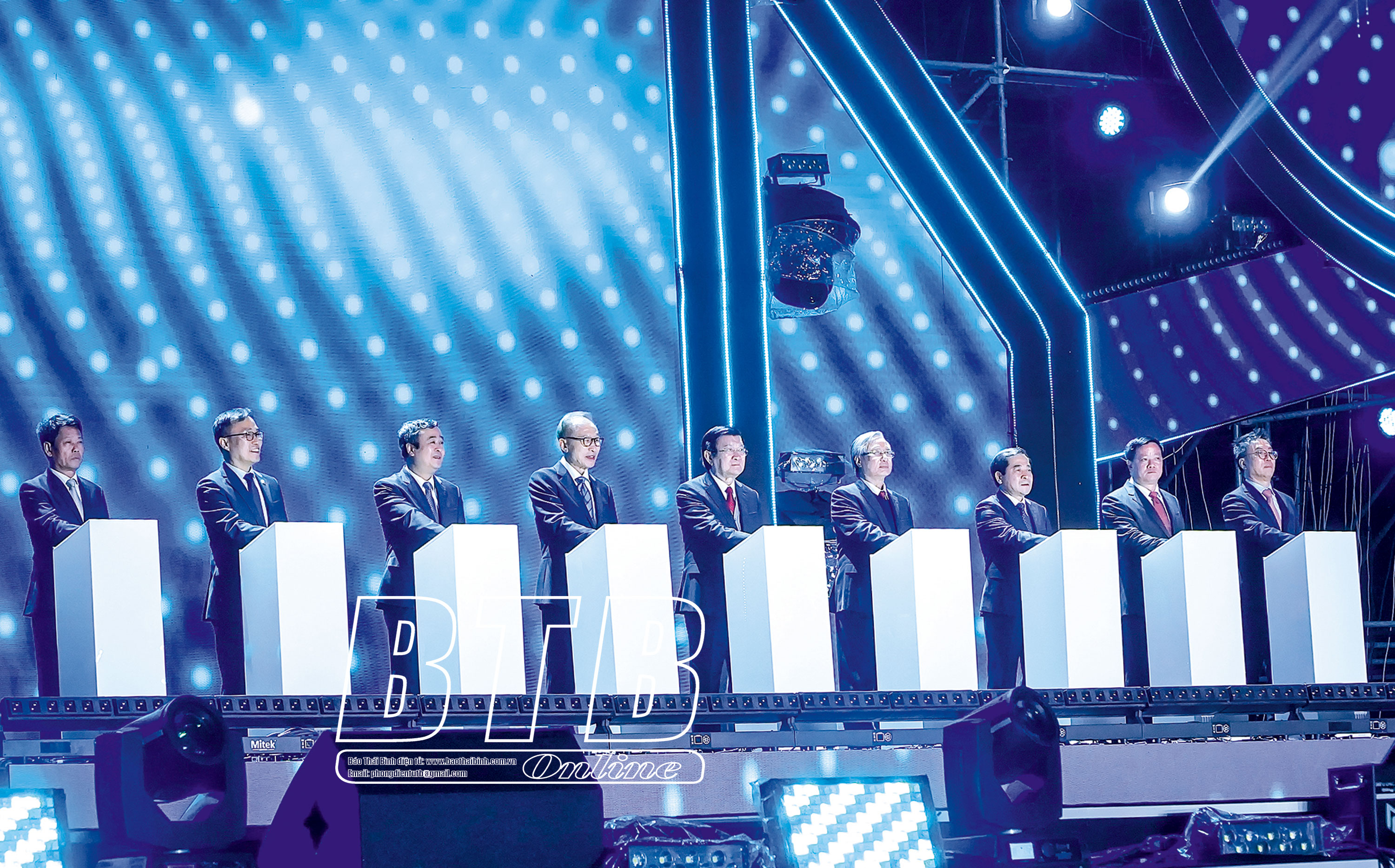 Nguyên Chủ tịch nước Trương Tấn Sang cùng các đồng chí lãnh đạo và đại biểu nhấn nút khai mạc chương trình “Thai Binh Homecoming Day” và hội chợ nông nghiệp quốc tế đồng bằng Bắc Bộ 2023, ngày 1/12/2023.