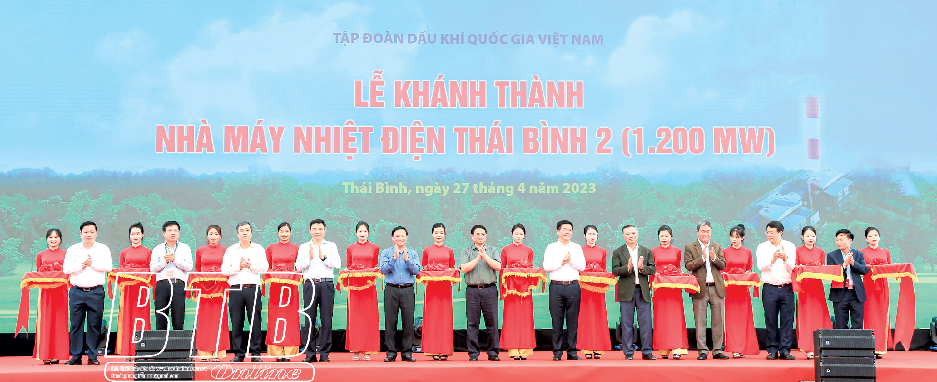 Thủ tướng Chính phủ Phạm Minh Chính cùng các đồng chí lãnh đạo cắt băng khánh thành Nhà máy nhiệt điện Thái Bình 2, ngày 27/4/2023.