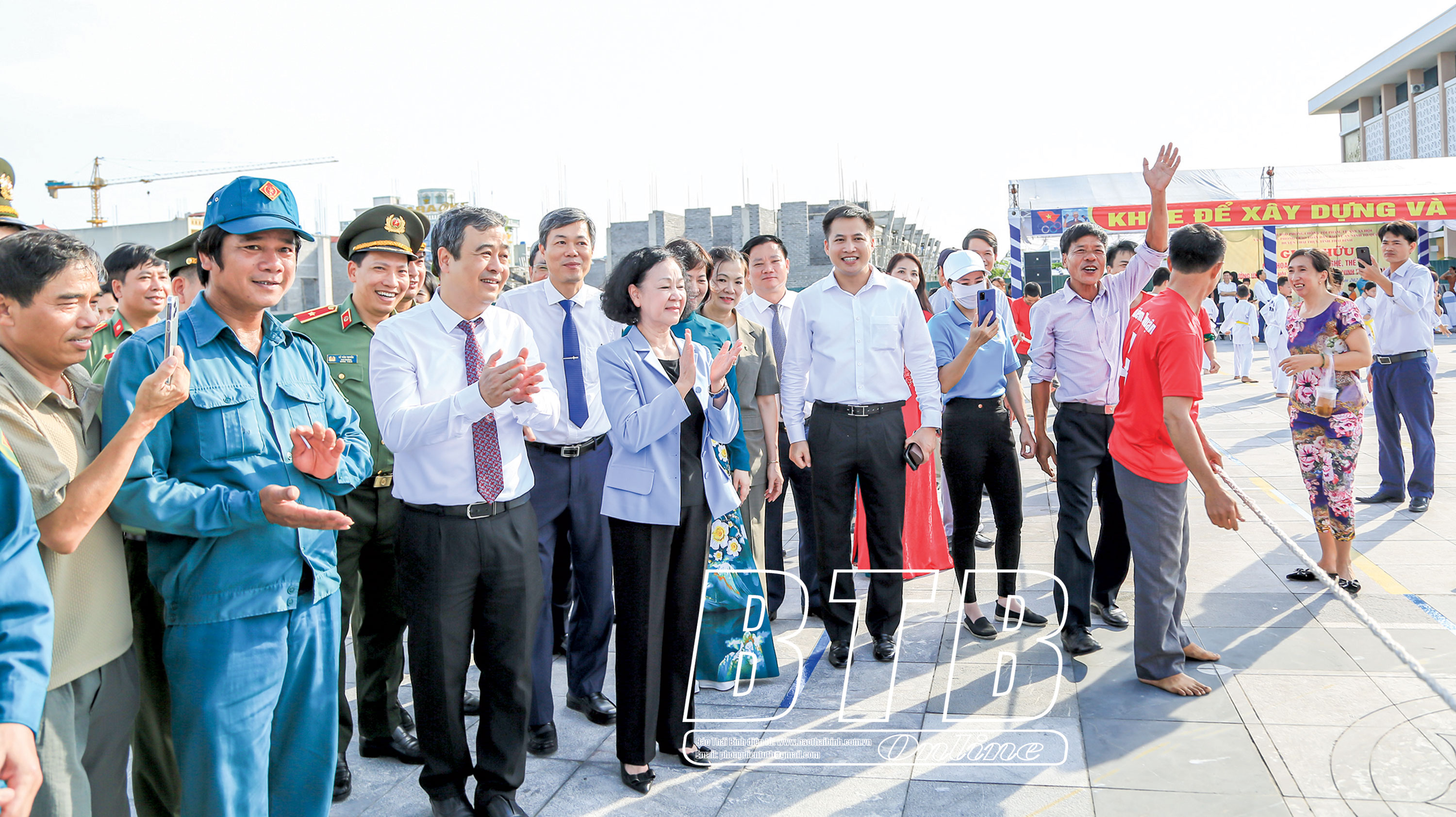 Đồng chí Trương Thị Mai, Ủy viên Bộ Chính trị, Thường trực Ban Bí thư, Trưởng ban Tổ chức Trung ương cùng các đồng chí lãnh đạo chung vui cùng nhân dân trong ngày hội toàn dân bảo vệ an ninh Tổ quốc tại thị trấn Diêm Điền (Thái Thụy), ngày 16/8/2023.