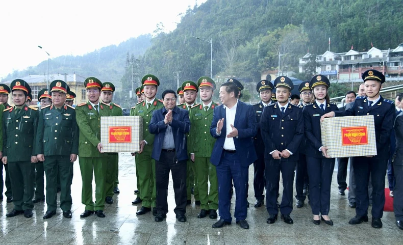 Thủ tướng Phạm Minh Chính thăm, tặng quà động viên các lực lượng chức năng tại Cửa khẩu quốc tế Trà Lĩnh.