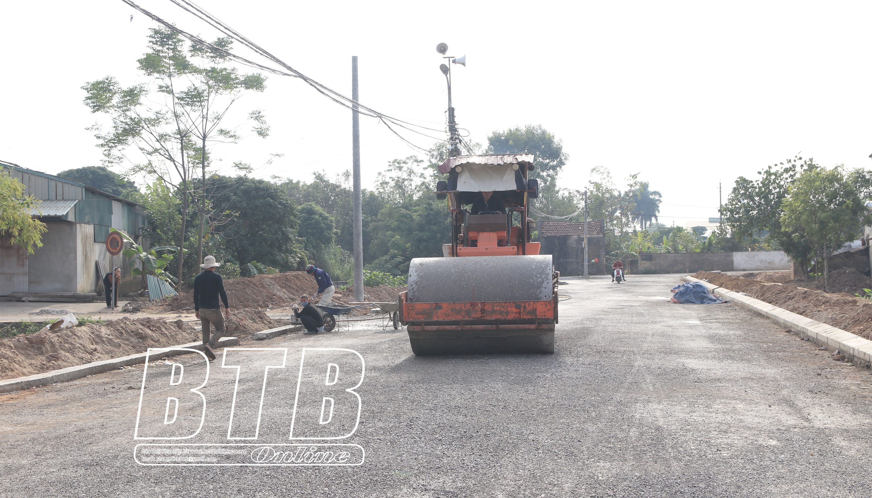 Thi công hạng mục cấp phối đá dăm, lu nèn tuyến đường đến trung tâm xã Vũ Đông, đoạn từ đường Trần Lãm qua thôn Tam Lạc, xã Vũ Lạc đến xã Vũ Đông.