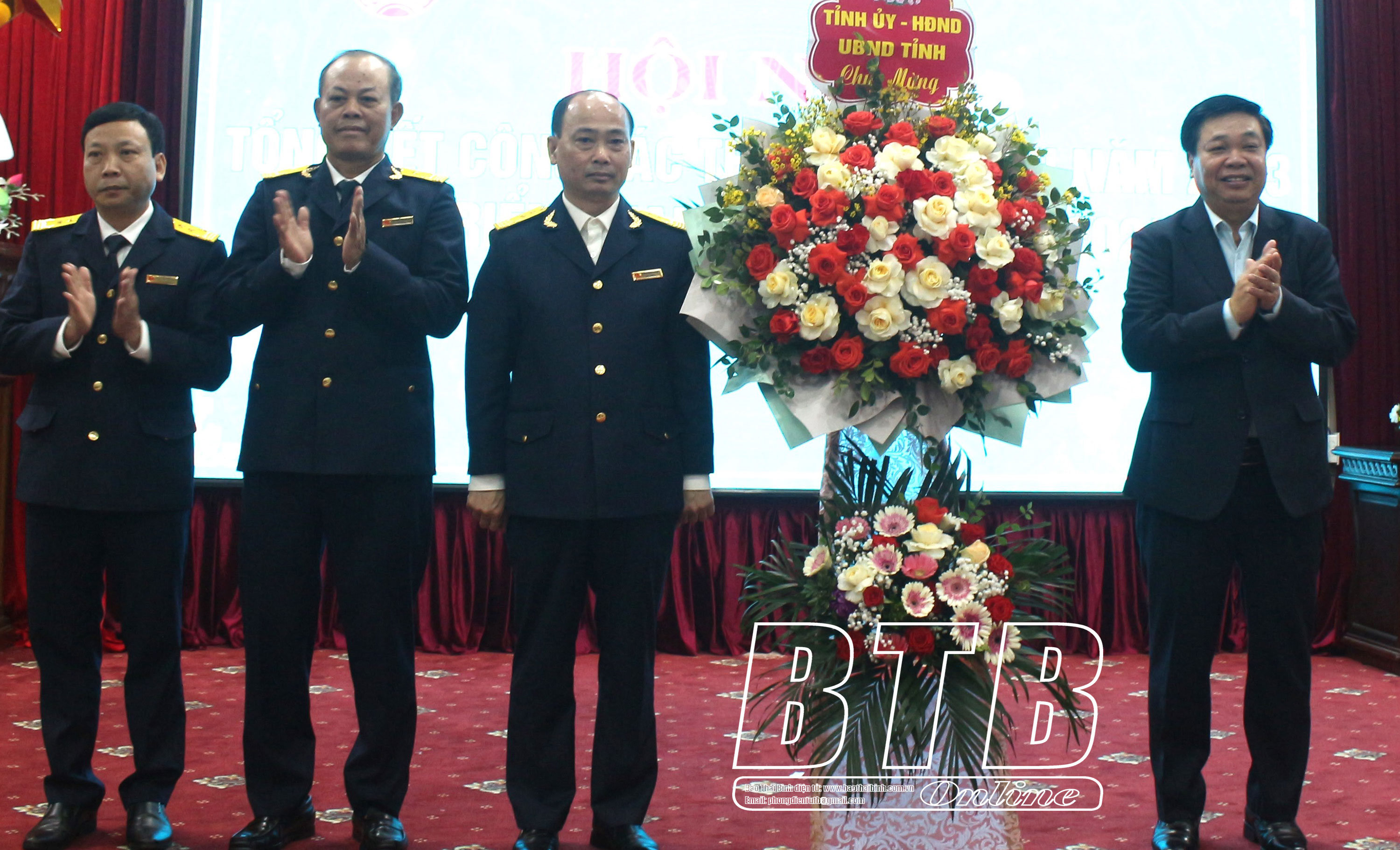 Đồng chí Nguyễn Quang Hưng, Ủy viên Ban Thường vụ Tỉnh ủy, Phó Chủ tịch thường trực UBND tỉnh, Trưởng ban Chỉ đạo thu ngân sách nhà nước tỉnh tặng lẵng hoa của Tỉnh ủy - HĐND- UBND tỉnh chúc mừng ngành thuế.