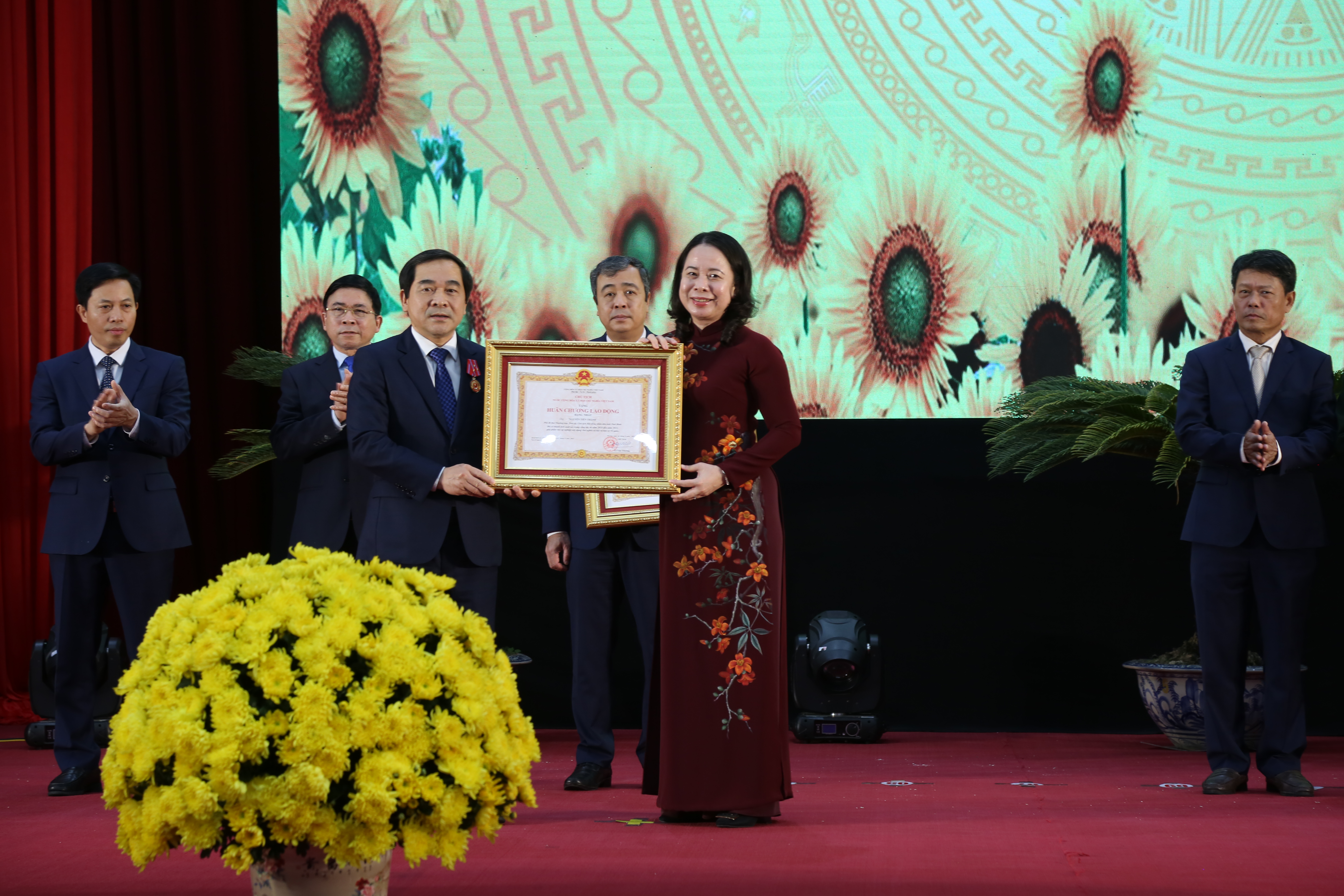 Đồng chí Võ Thị Ánh Xuân, Ủy viên Ban Chấp hành Trung ương Đảng, Phó Chủ tịch nước trao Huân chương Lao động hạng Nhì cho đồng chí Ngô Đông Hải, Ủy viên Ban Chấp hành Trung ương Đảng, Bí thư Tỉnh ủy.