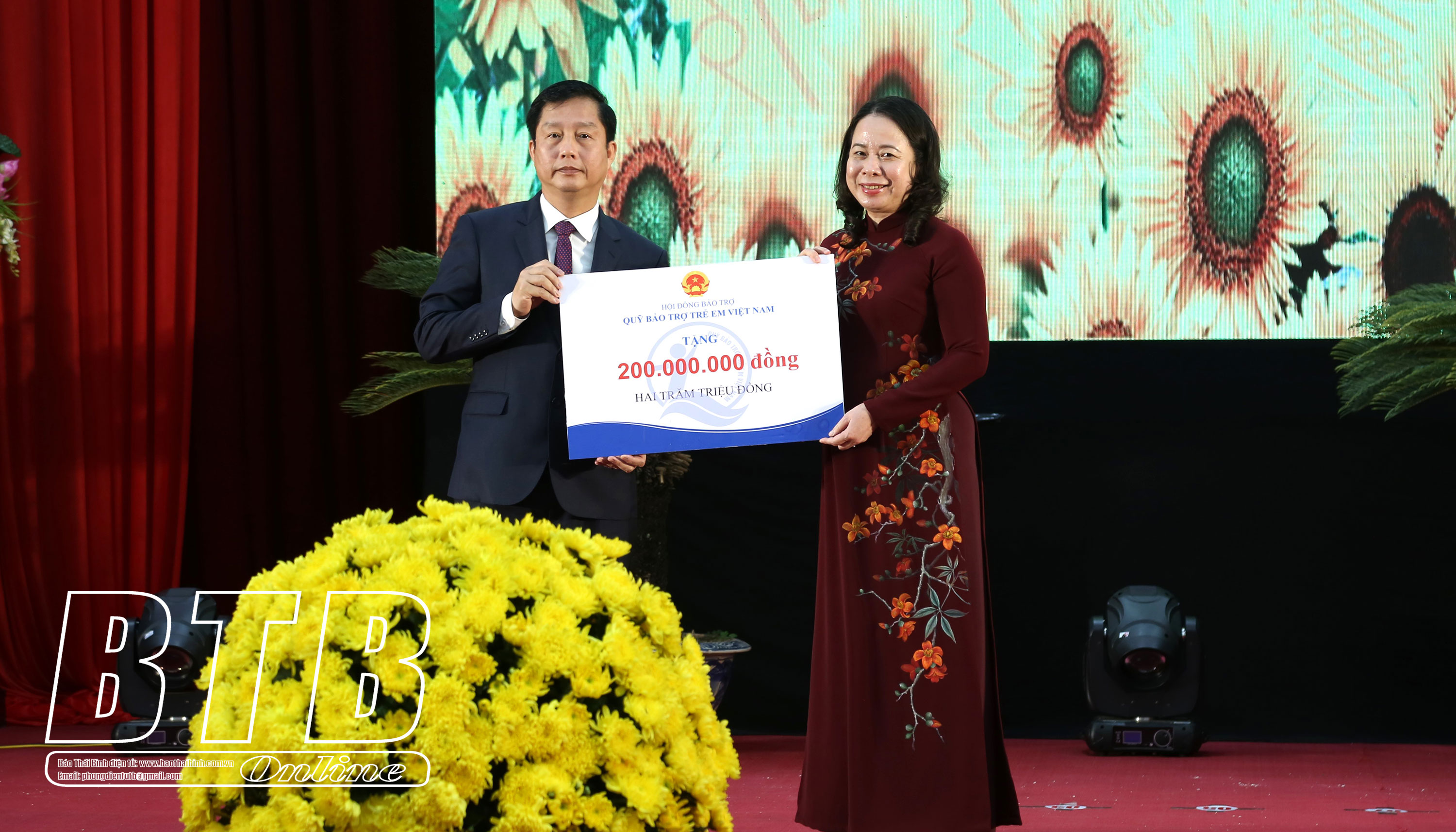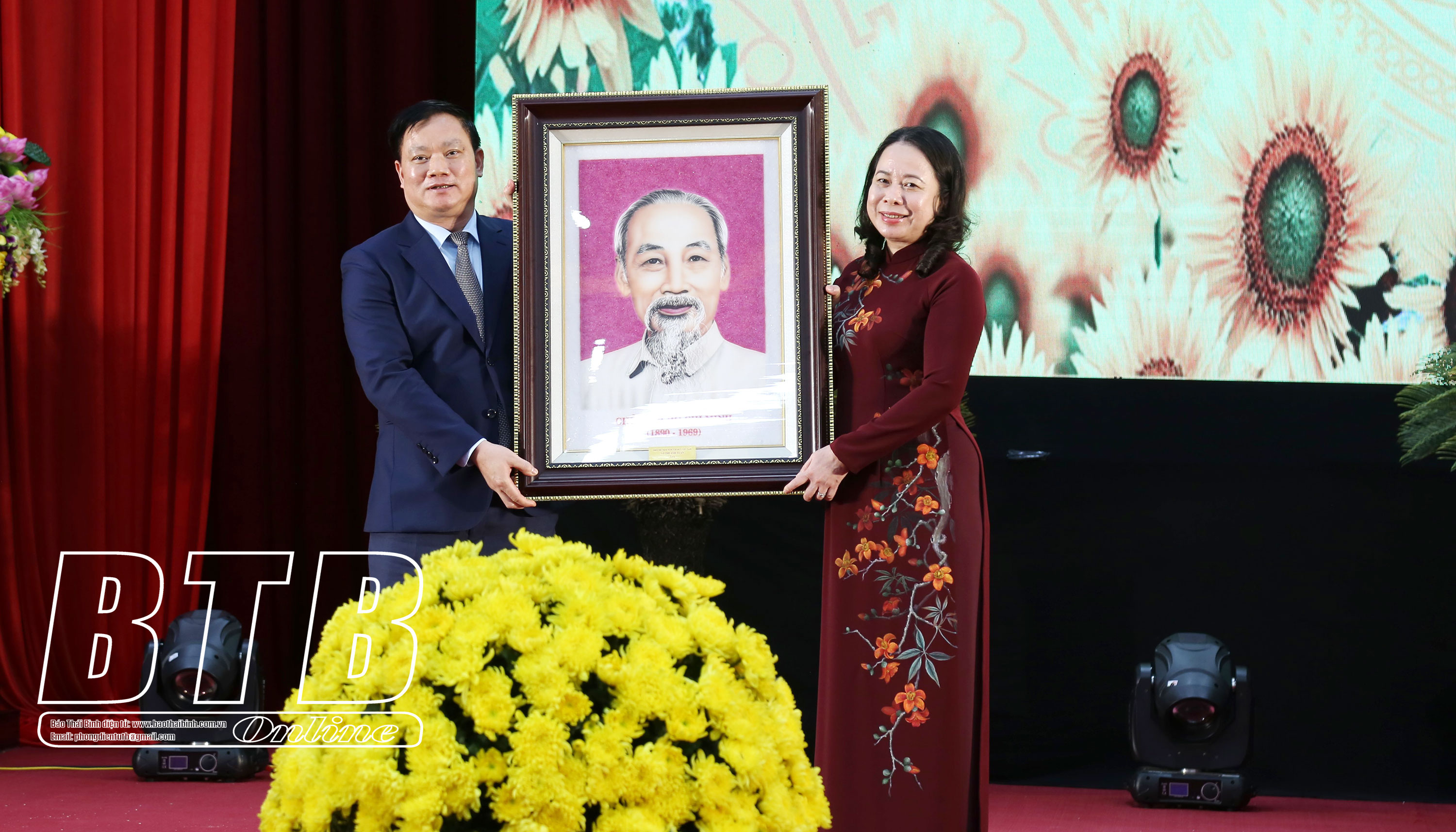 Nhân dịp này, đồng chí Phó Chủ tịch nước đã tặng Đảng bộ, chính quyền và nhân dân tỉnh Thái Bình bức chân dung Chủ tịch Hồ Chí Minh và tặng quà cho trẻ em nghèo, có hoàn cảnh khó khăn.