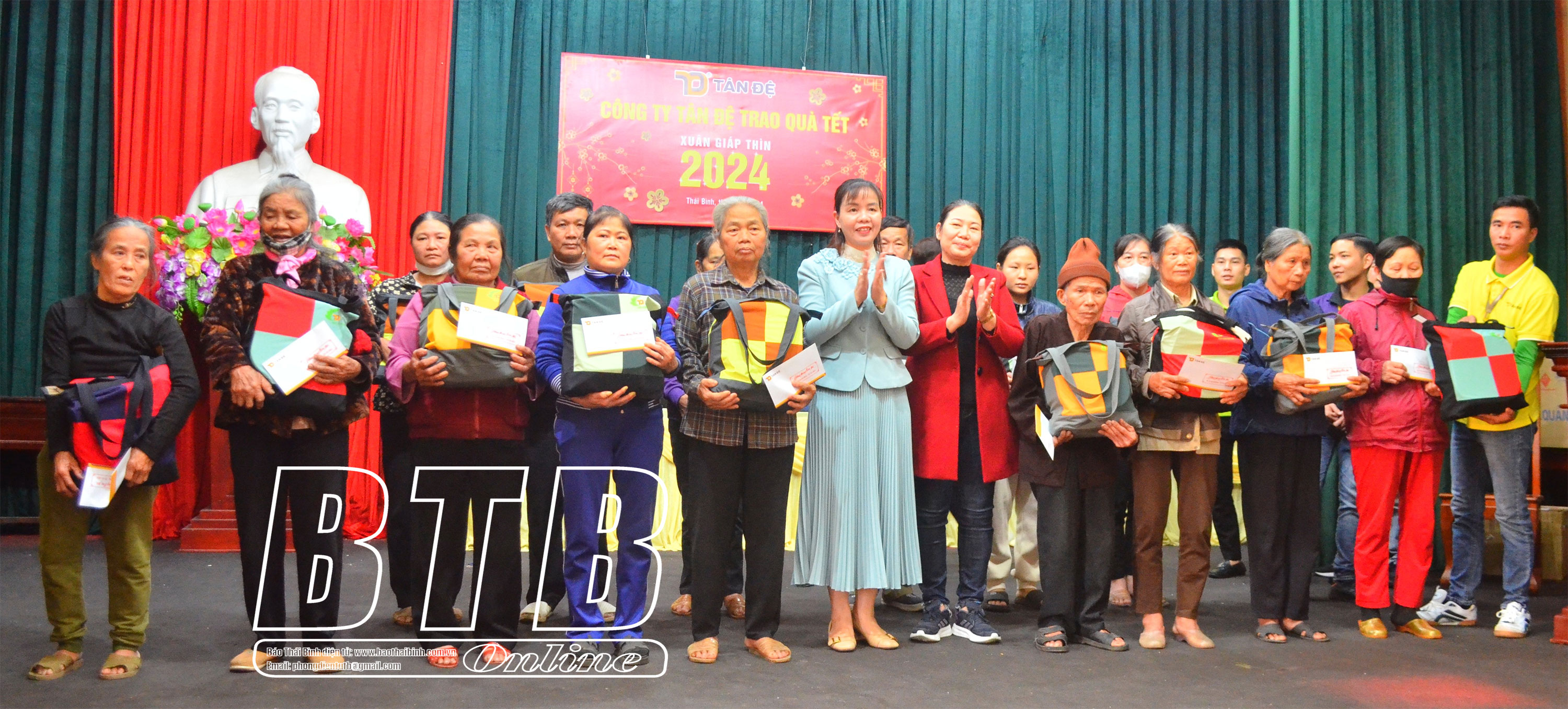 Sáng ngày 15/1, Công ty Tân Đệ phối hợp với Phòng Lao động - Thương binh và Xã hội thành phố Thái Bình tổ chức trao quà cho hộ có hoàn cảnh khó khăn trên địa bàn phường Hoàng Diệu nhân dịp tết Nguyên đán Giáp Thìn năm 2024.