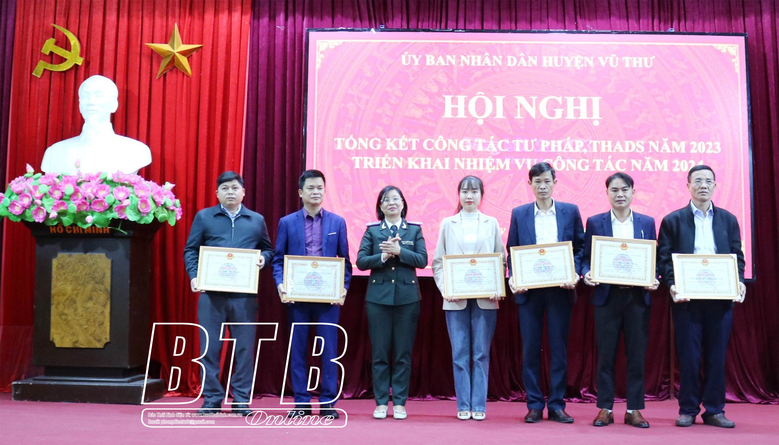 Năm 2023, huyện Vũ Thư xây dựng và vận hành hiệu quả cơ sở dữ liệu hộ tịch điện tử, kết nối thông suốt với cơ sở dữ liệu quốc gia về dân cư. Toàn huyện có 209 tổ hòa giải, tham gia hòa giải thành công 135/167 vụ việc mâu thuẫn tại cơ sở. Huyện Vũ Thư duy trì dẫn đầu công tác tư pháp của tỉnh. Từ ngày 1/10/2022 - 30/9/2023, Chi cục Thi hành án dân sự huyện Vũ Thư thụ lý tổng số 784 vụ việc, trong đó 534 vụ việc có điều kiện thi hành, đến nay đã thi hành xong 88,06% vụ việc, vượt 4,66% chỉ tiêu giao.