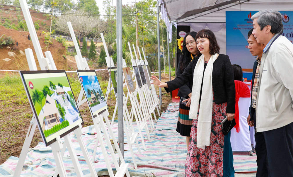 Các đại biểu nghe giới thiệu về phối cảnh công trình tu bổ, tôn tạo Di tích lịch sử Quốc gia Địa điểm Trường dạy làm báo Huỳnh Thúc Kháng.