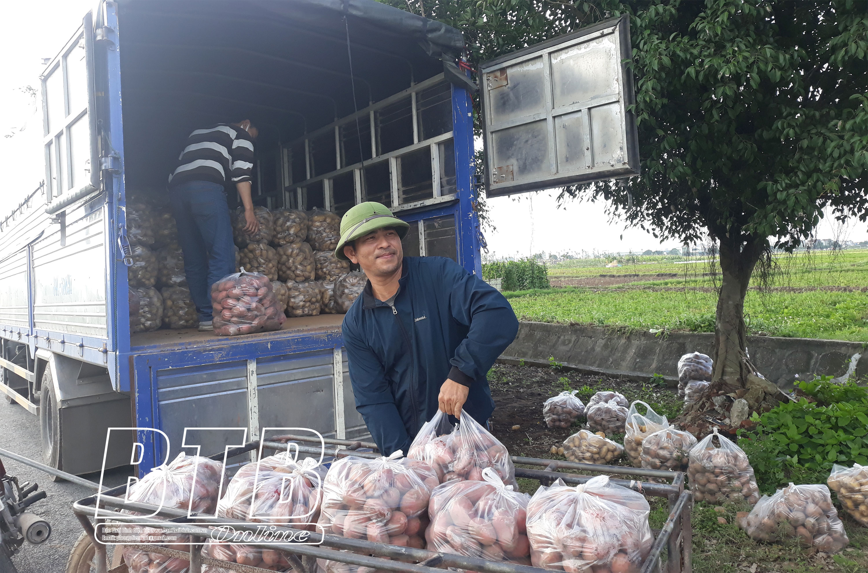 Thương lái từ tỉnh Hải Dương đến thu mua khoai tây ở xã Vũ An.