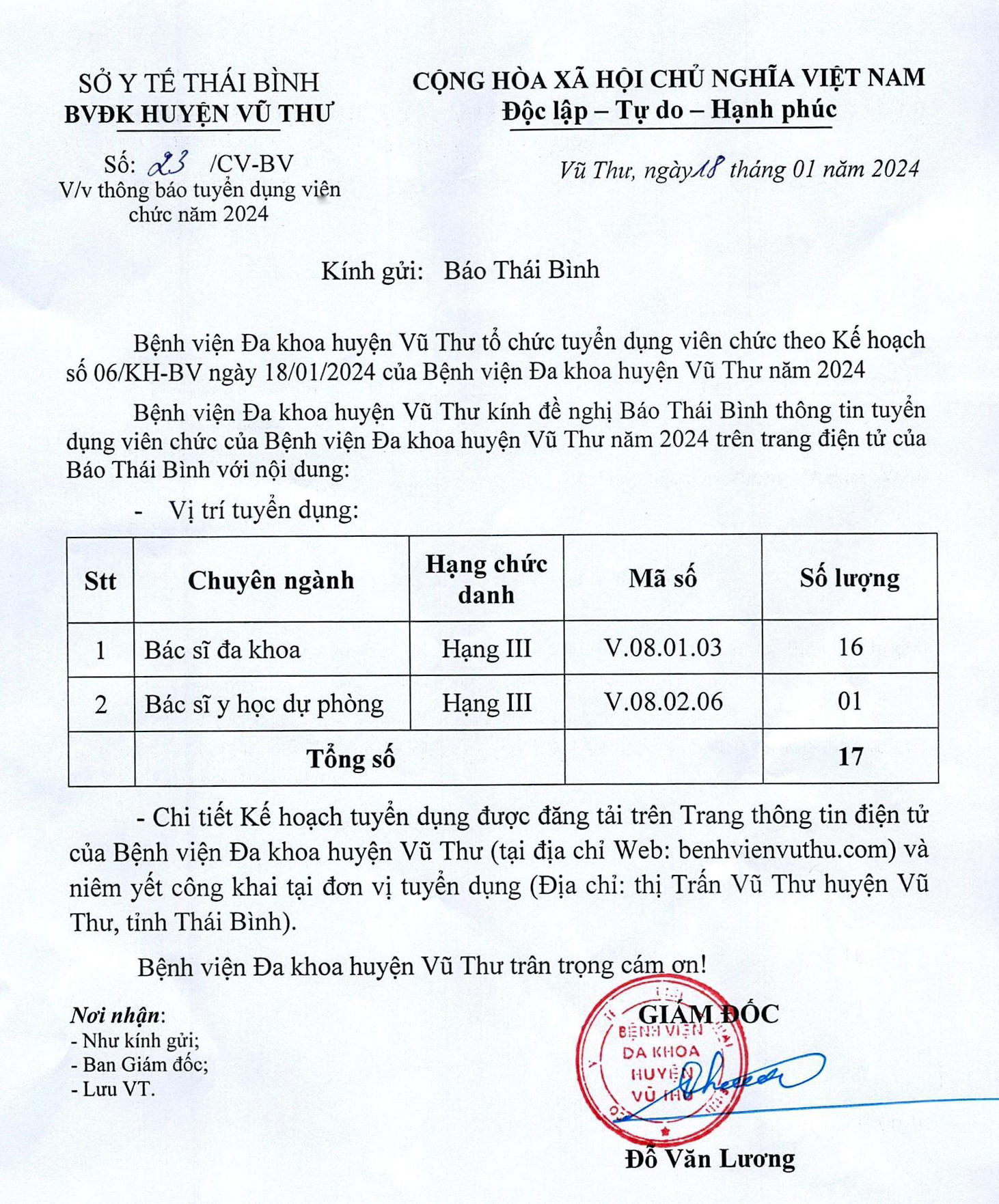 Bệnh viện Đa khoa huyện Vũ Thư: Thông báo tuyển dụng viên chức năm 2024