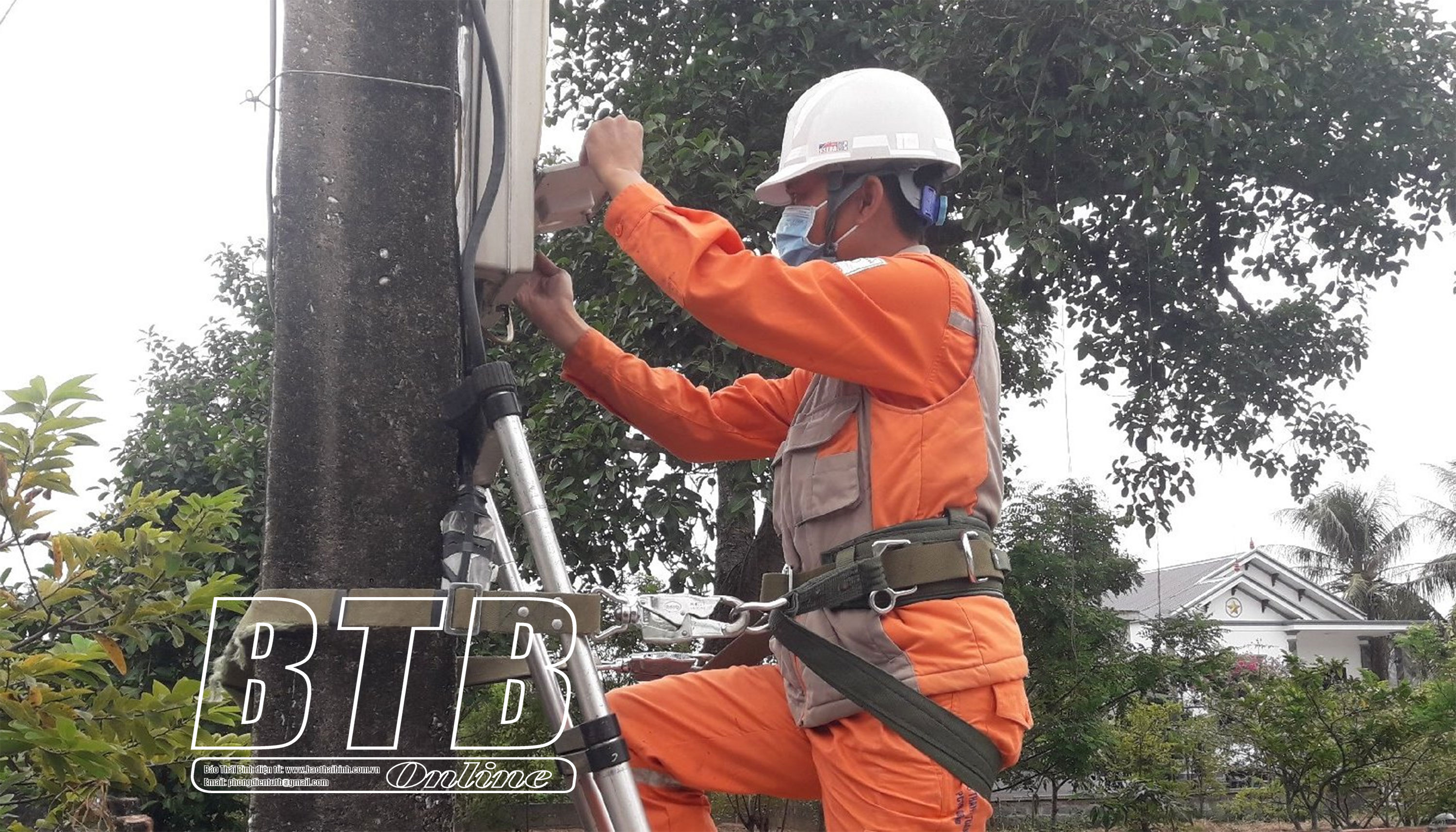 Công nhân Điện lực Thái Thụy lắp đặt dây sau công tơ miễn phí cho khách hàng trong tháng tri ân.
