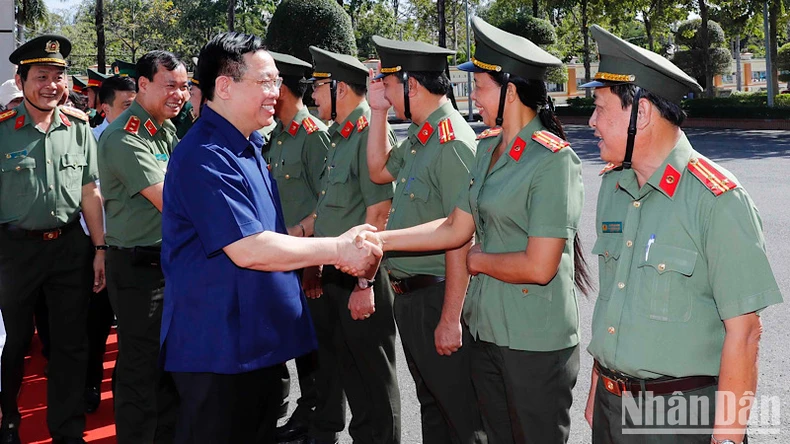 Đồng chí Vương Đình Huệ thăm lực lượng Công an tỉnh Bạc Liêu. (Ảnh: NHAN SÁNG).