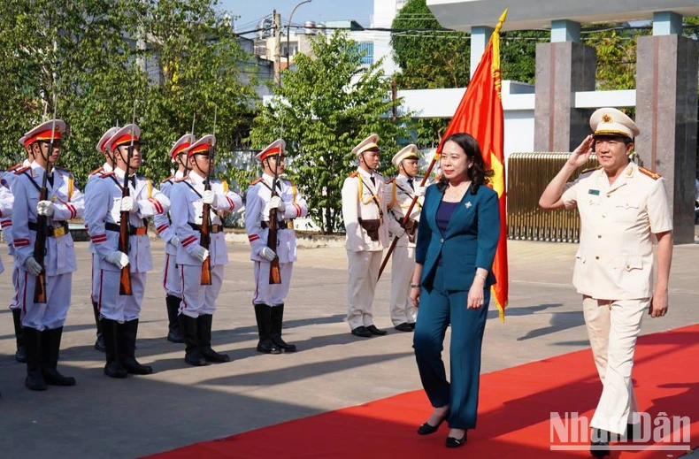 Giám đốc Công an tỉnh Long An Lâm Minh Hồng đón tiếp Phó Chủ tịch nước Võ Thị Ánh Xuân đến chúc Tết Lực lượng Công an Long An.
