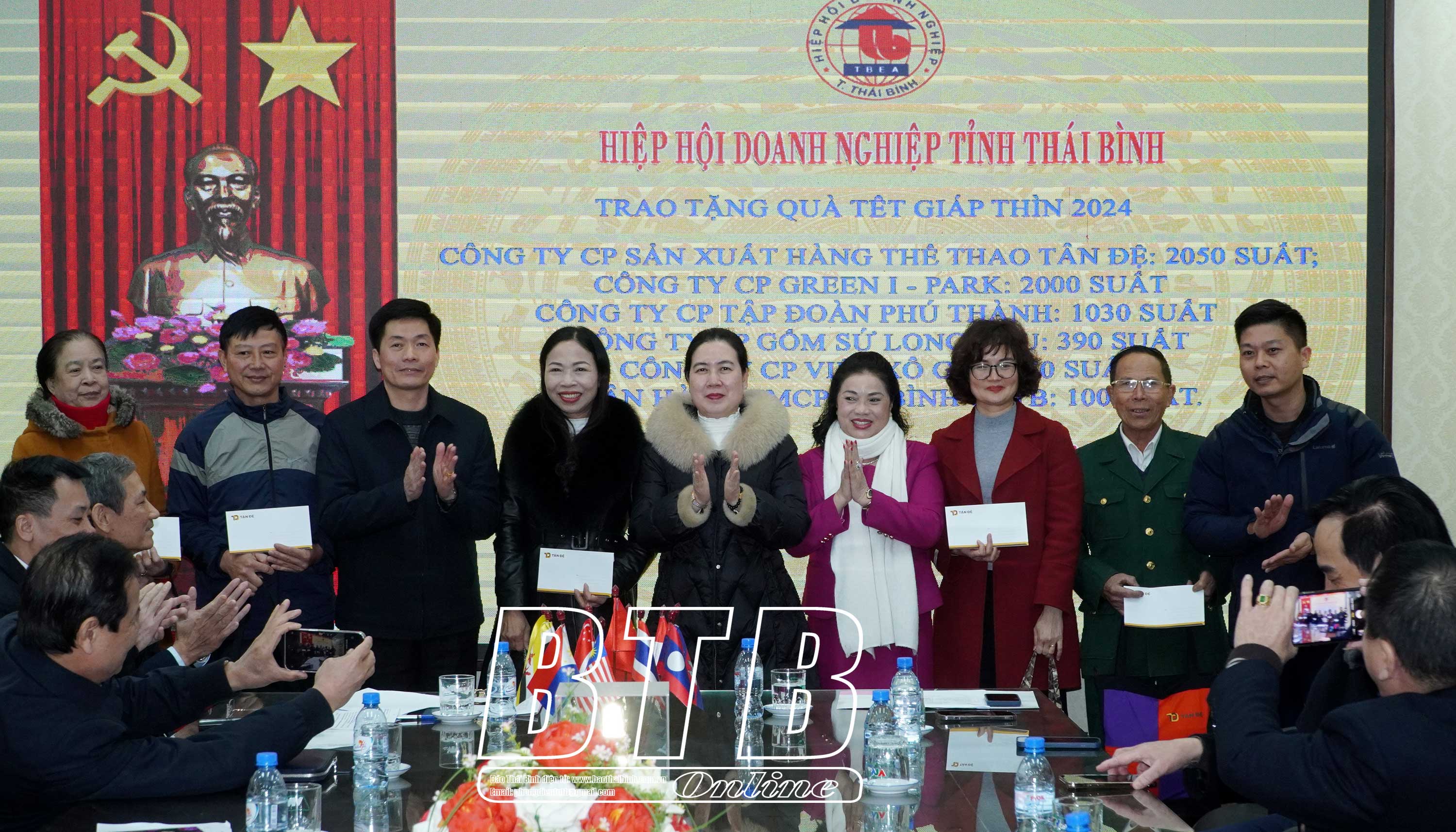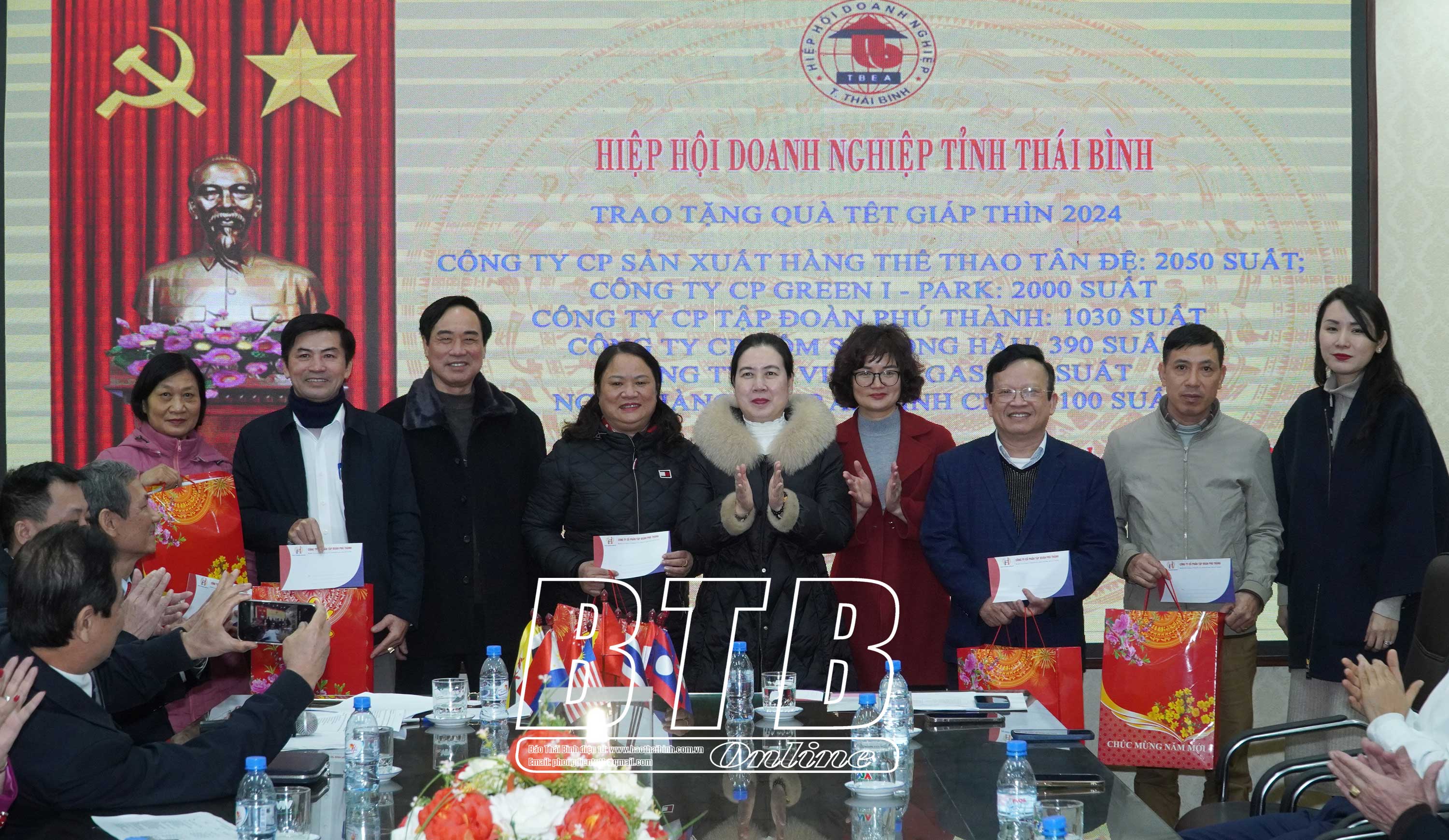 6 doanh nghiệp trao tặng quà tết gồm Công ty Cổ phần Sản xuất hàng thể thao Chi nhánh Thái Bình (Công ty Tân Đệ), Công ty Cổ phần Green i-Park, Công ty Cổ phần Tập đoàn Phú Thành, Công ty Cổ phần Gốm sứ Long Hầu, Công ty Cổ phần Việt Xô gas và Ngân hàng Thương mại Cổ phần An Bình Chi nhánh Thái Bình.