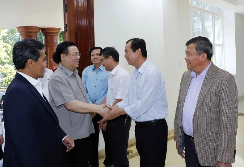 Chủ tịch Quốc hội Vương Đình Huệ với các đồng chí Tỉnh ủy Gia Lai. Ảnh: NHAN SÁNG/TTXVN.