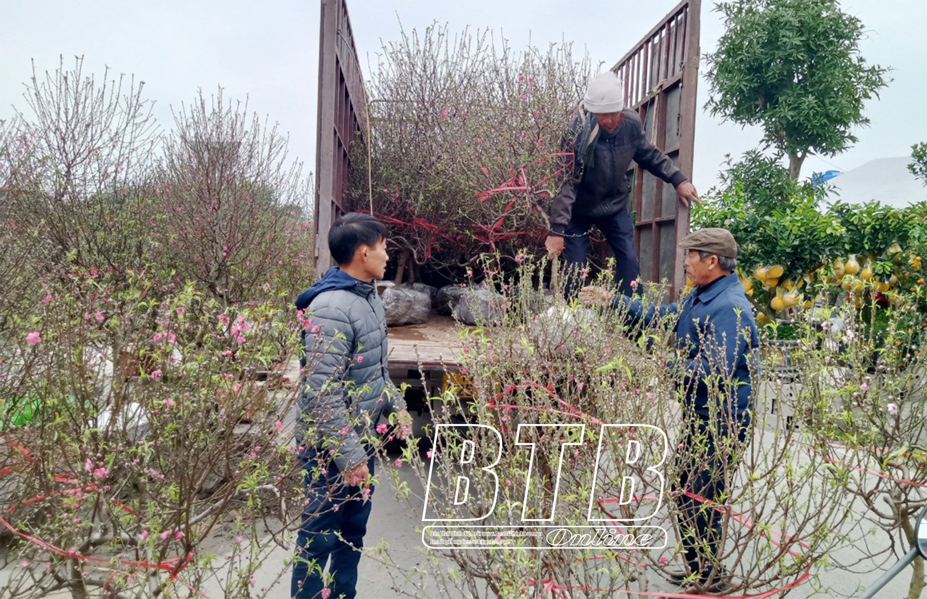 Các chủ vườn vận chuyển đào xuống chợ hoa.