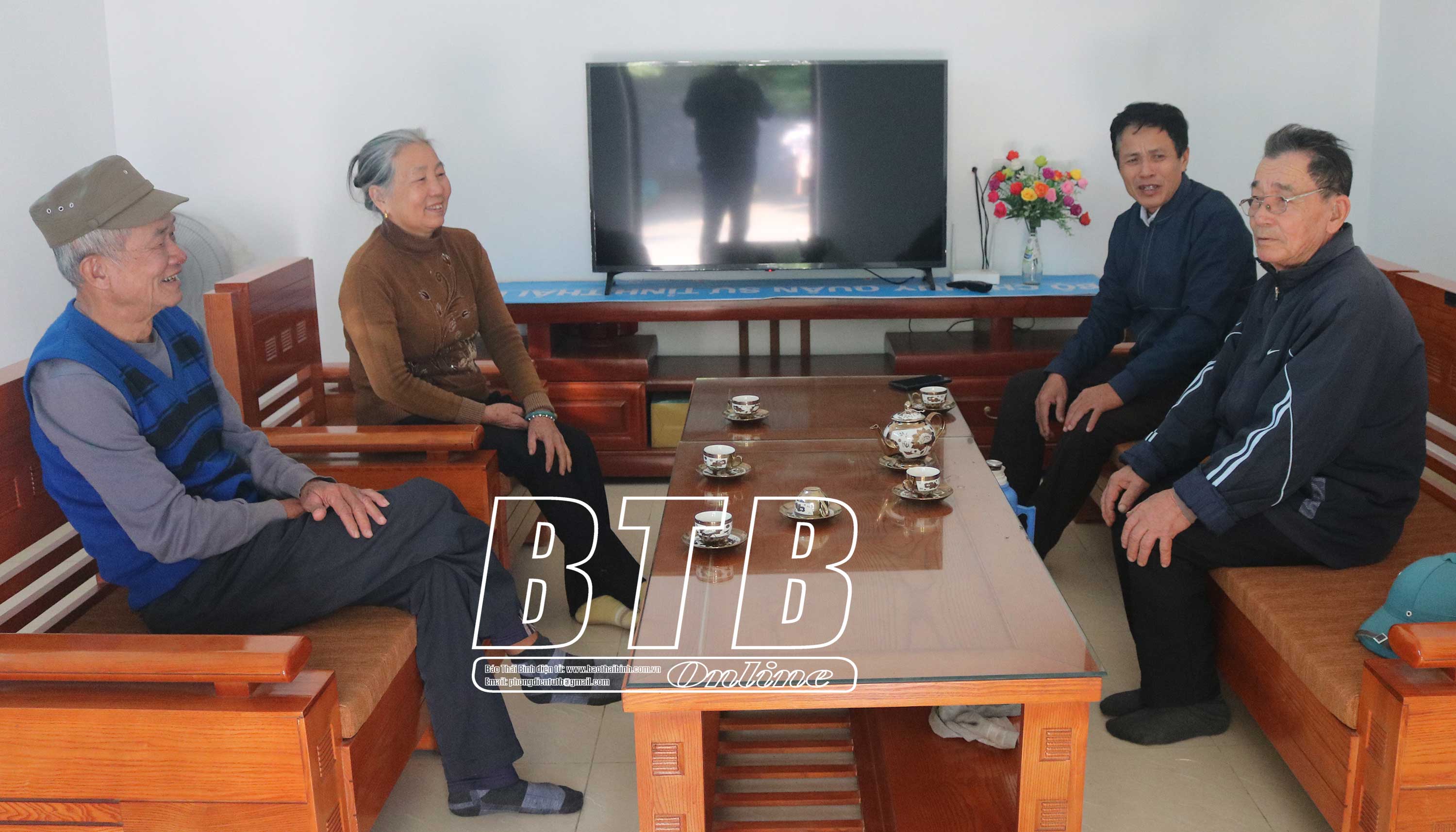 Bà con đến chung vui cùng cựu chiến binh Mai Ngọc Xuyên (người ngoài cùng bên phải) nhân dịp tết Nguyên đán Giáp Thìn 2024.