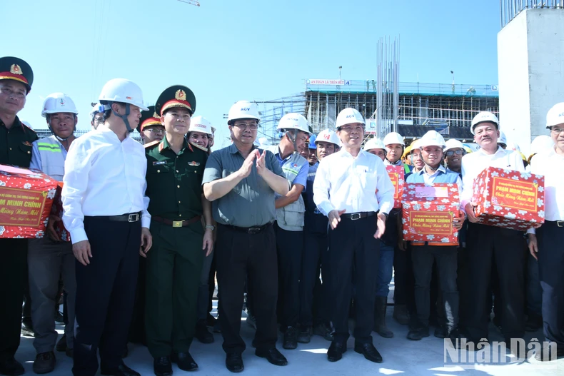 Thủ tướng Phạm Minh Chính tặng quà động viên, chúc Tết các đơn vị tham gia thi công Nhà ga hành khách T3 Cảng hàng không quốc tế Tân Sơn Nhất. Ảnh: THANH GIANG.