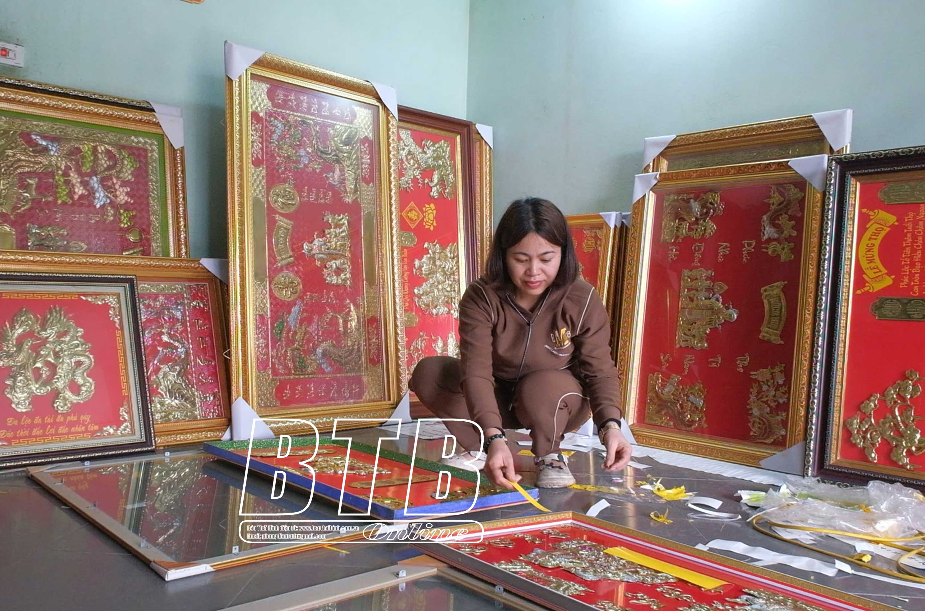 Chị Đào Thị Hoài, Phú Châu (Đông Hưng) hoàn thiện tranh đồng mừng thọ để phục vụ nhu cầu của khách hàng.