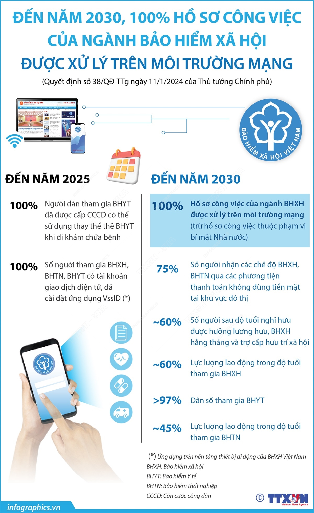 Chiến lược phát triển ngành Bảo hiểm xã hội Việt Nam đến năm 2030, ngành Bảo hiểm Xã hội Việt Nam đặt ra chỉ tiêu đến năm 2030, khoảng 60% lao động trong độ tuổi tham gia bảo hiểm xã hội, khoảng 60% số người sau độ tuổi nghỉ hưu được hưởng lương hưu, bảo hiểm xã hội hàng tháng và trợ cấp hưu trí xã hội; trên 97% dân số tham gia bảo hiểm y tế…
