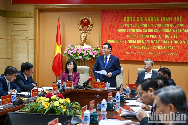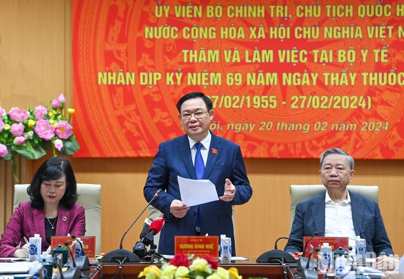 Nhấn mạnh “nghề y là một nghề đặc biệt, nhân lực y tế cần được tuyển chọn, đào tạo, sử dụng và đãi ngộ đặc biệt; phải đáp ứng yêu cầu chuyên môn và y đức”, Chủ tịch Quốc hội đề nghị Bộ Y tế, các bộ, ngành liên quan tập trung hơn nữa cho công tác bồi dưỡng, xây dựng đội ngũ cán bộ, bác sĩ, nhân viên ngành y tế vững vàng về chính trị, chuyên môn, gương mẫu về đạo đức, không ngừng đổi mới tác phong làm việc theo hướng chuyên nghiệp “lấy người bệnh làm trung tâm”, nâng cao y đức, tinh thần, thái độ phục vụ người bệnh tận tình, chu đáo; từng bước đưa công tác đào tạo nguồn nhân lực y tế hội nhập quốc tế, có chất lượng cao về chuyên môn và y đức.