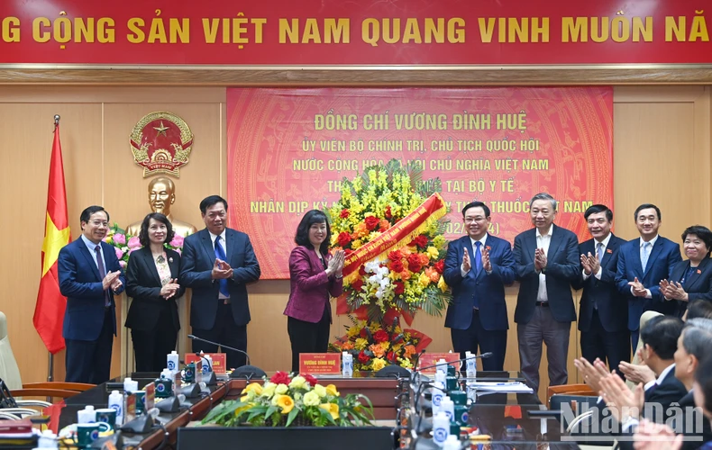 Chủ tịch Quốc hội Vương Đình Huệ tặng hoa chúc mừng ngành y tế nhân kỷ niệm 69 năm Ngày Thầy thuốc Việt Nam.