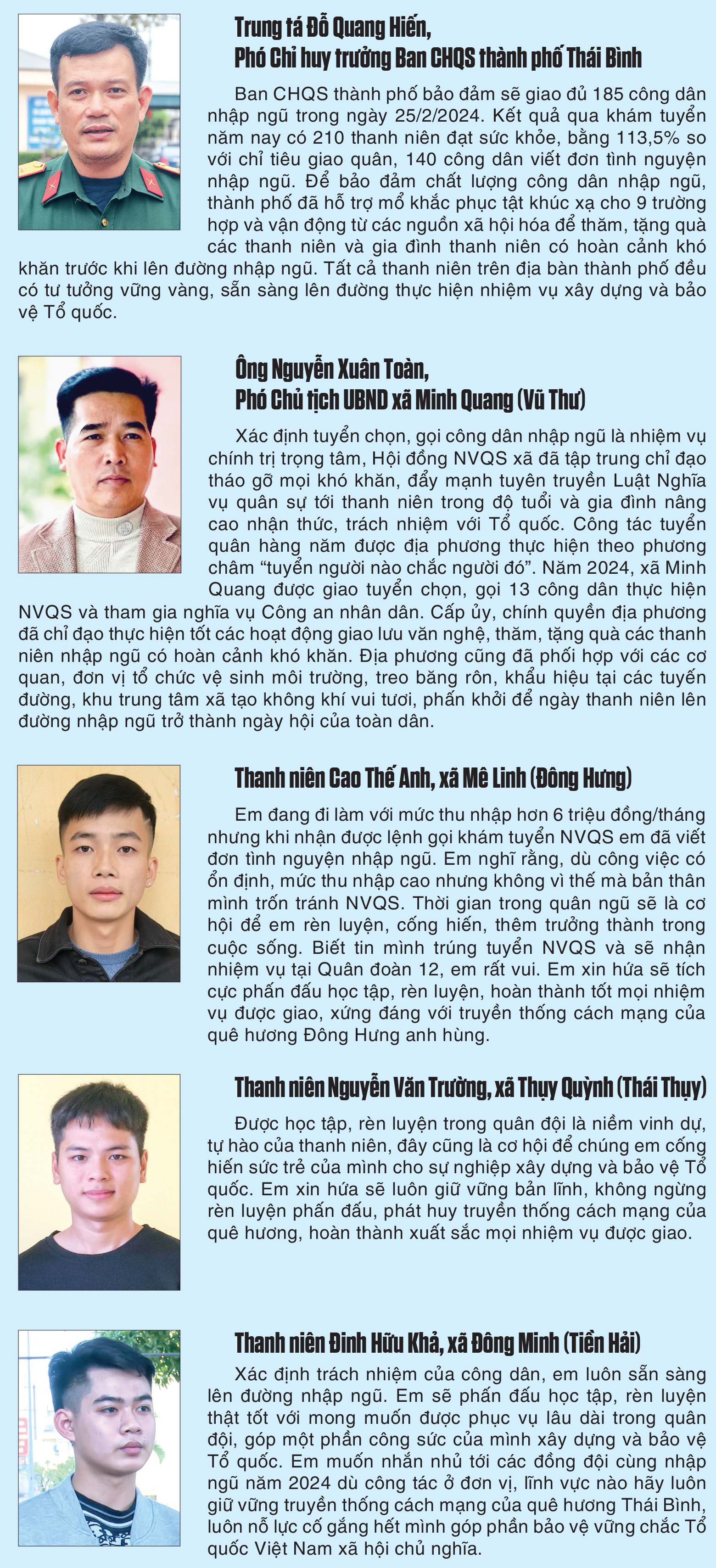 Đại tá Nguyễn Ngọc Tuệ, Ủy viên Ban Thường vụ Tỉnh ủy, Chỉ huy trưởng Bộ CHQS tỉnh, Phó Chủ tịch thường trực Hội đồng NVQS tỉnh cho biết: Năm 2024, Thái Bình được giao tuyển chọn, bàn giao 2.752 công dân cho 18 đầu mối đơn vị nhận quân của Bộ Quốc phòng, Quân khu 3, giao 305 công dân cho các đơn vị của Bộ Công an. Đến thời điểm này, toàn tỉnh đã hoàn thành phát lệnh gọi nhập ngũ, cấp phát quân trang. Công dân đã nhận lệnh gọi nhập ngũ có tư tưởng tốt đạt 107% so với chỉ tiêu trên giao. Chất lượng công dân nhập ngũ năm 2024 tốt hơn năm 2023 về sức khỏe cũng như trình độ văn hóa (430 công dân có trình độ cao đẳng, đại học, bằng 15,63%, tăng 4,68% so với năm 2023). 1.092 thanh niên viết đơn tình nguyện nhập ngũ. Bộ CHQS tỉnh đã chỉ đạo ban CHQS các huyện, thành phố phối hợp tổ chức bồi dưỡng nhận thức về Đảng cho 1.318 thanh niên; đồng thời, huy động nguồn kinh phí xã hội hóa hỗ trợ mổ khắc phục tật khúc xạ về mắt cho các thanh niên nhập ngũ.