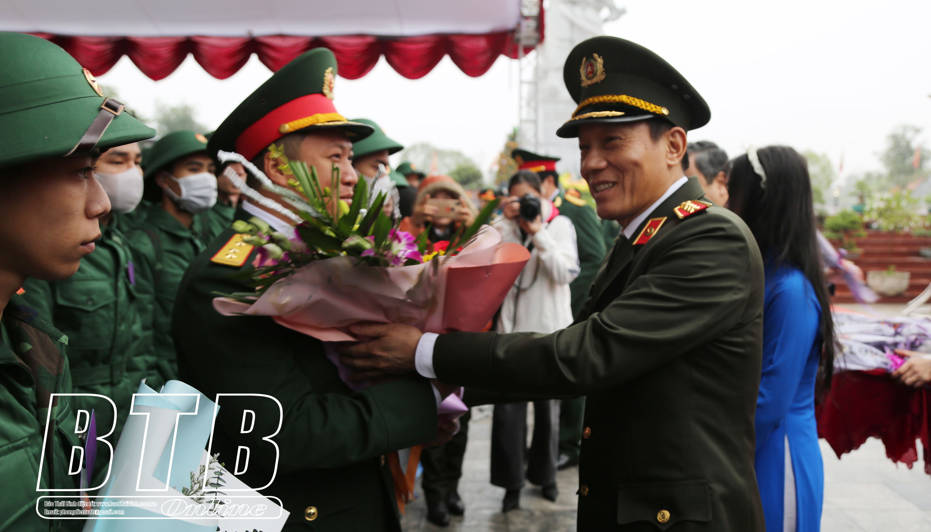 Thứ trưởng Bộ Công an Lương Tam Quang và đồng chí Bí thư Tỉnh ủy dự lễ giao, nhận quân tại huyện Quỳnh Phụ