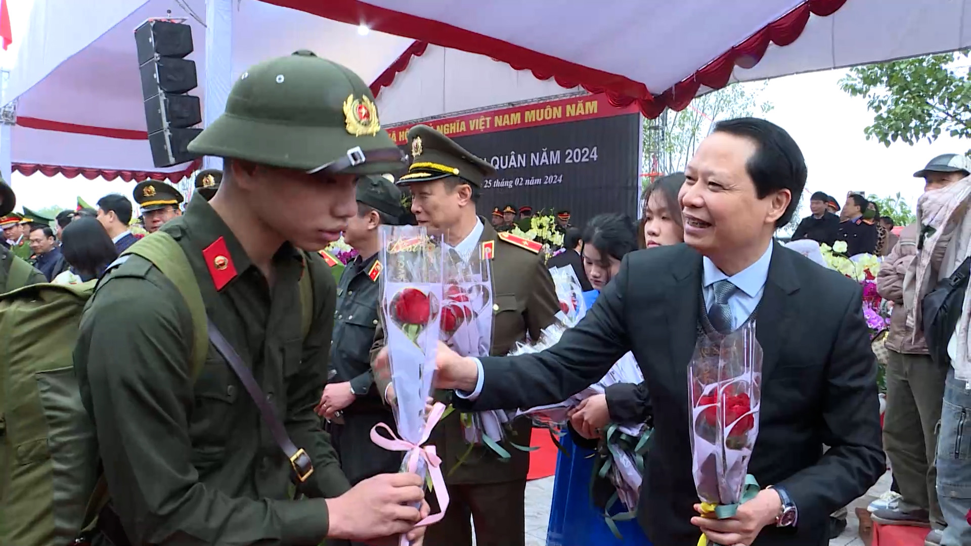 Tại buổi lễ, đồng chí Thứ trưởng Bộ Công an và đồng chí Bí thư Tỉnh ủy; lãnh đạo Quân khu 3 cùng các đồng chí lãnh đạo tỉnh, huyện đã tặng hoa, động viên tân binh lên đường nhập ngũ.